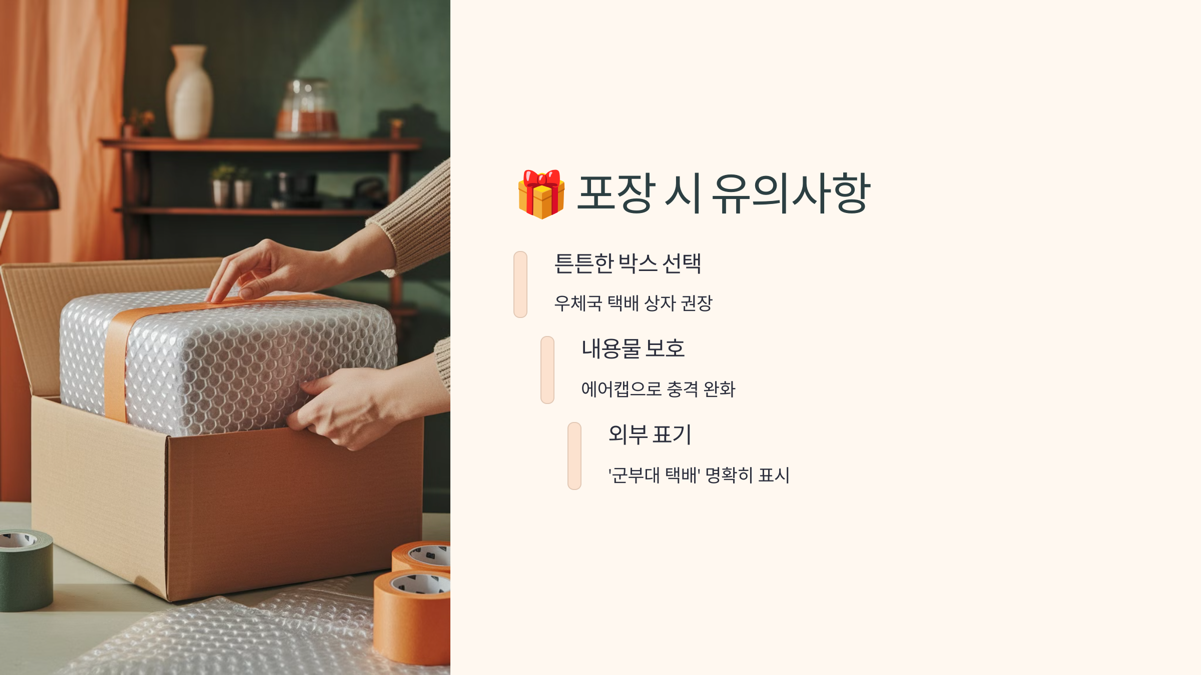 포장이 제대로 되어야 부대 정문에서 문제 없이 전달되고, 택배 사고도 줄어들어요.