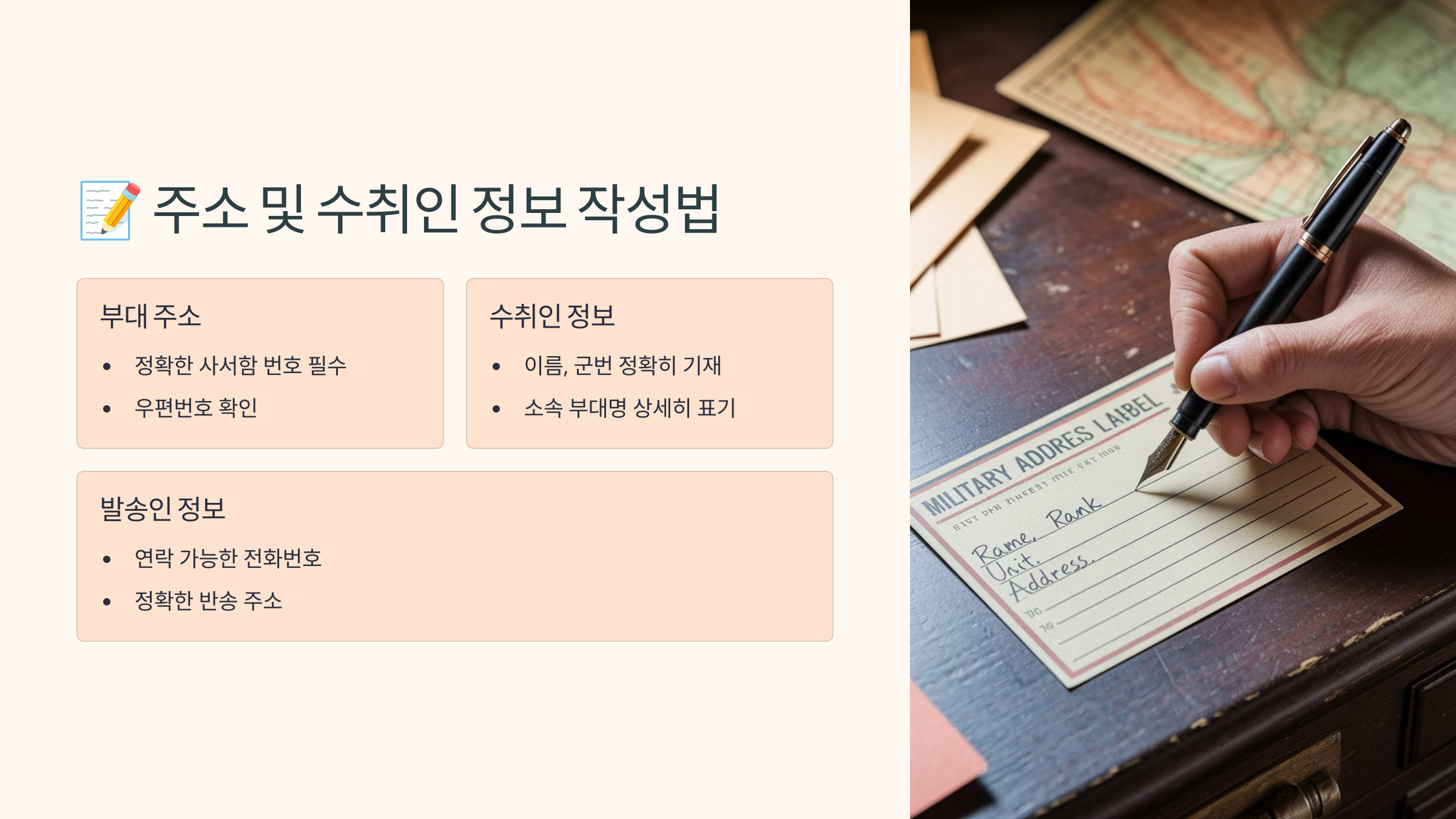 이름, 소속부대, 사서함 번호, 중대명까지 빠짐없이 기재해야 안전하게 전달될 수 있어요. 📮