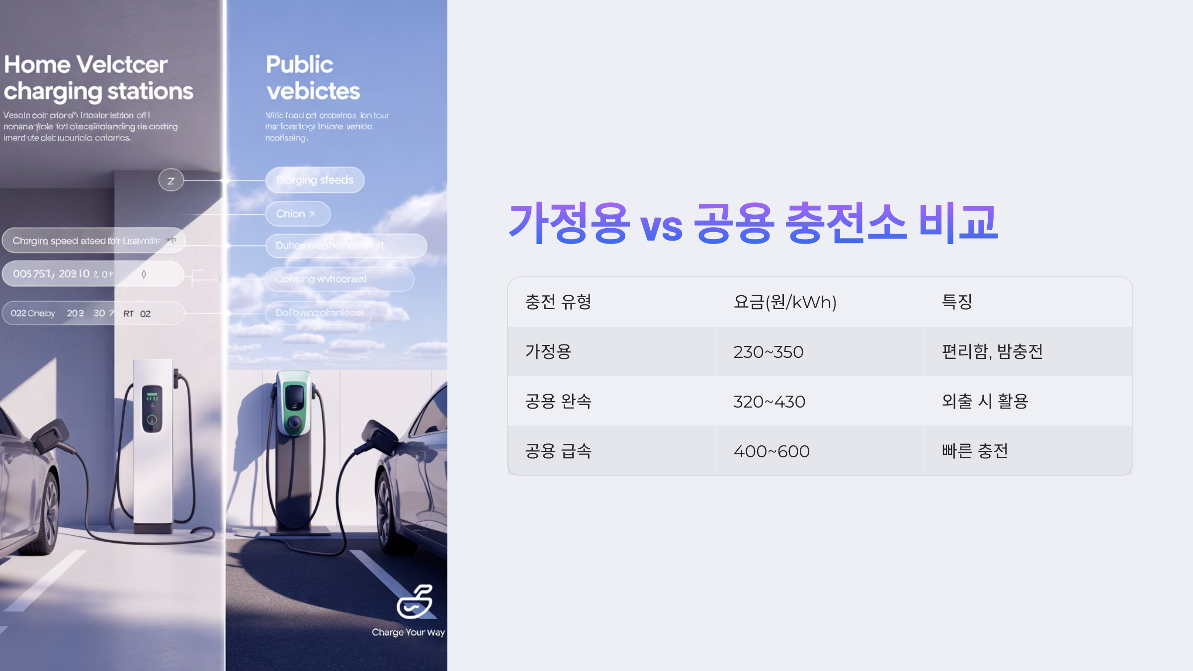 "가정용 충전이 진짜 싸긴 한 걸까?" 이런 궁금증을 풀어드릴게요. 바로 가정용 충전요금과 공용 충전소 요금을 비교해볼게요! 📊