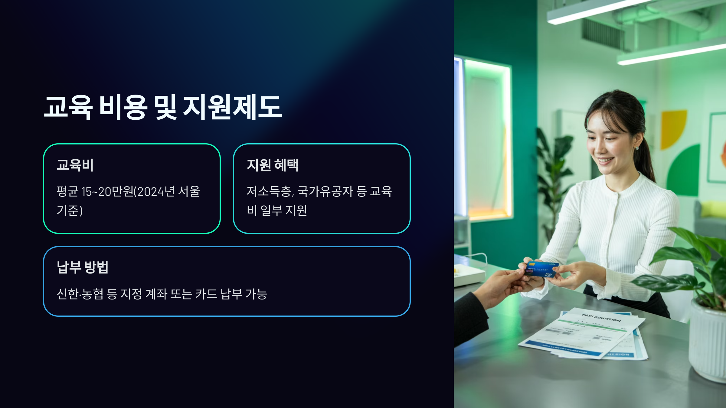 하지만 부담이 되는 분들을 위해 정부나 지자체에서 다양한 지원제도를 마련해두고 있어요. 예를 들어, 고용노동부의 내일배움카드를 활용할 수 있는 지역도 있고, 서울시는 일정 기준 이하의 수입을 가진 법인택시 기사를 대상으로 교육비 전액을 지원하기도 해요.