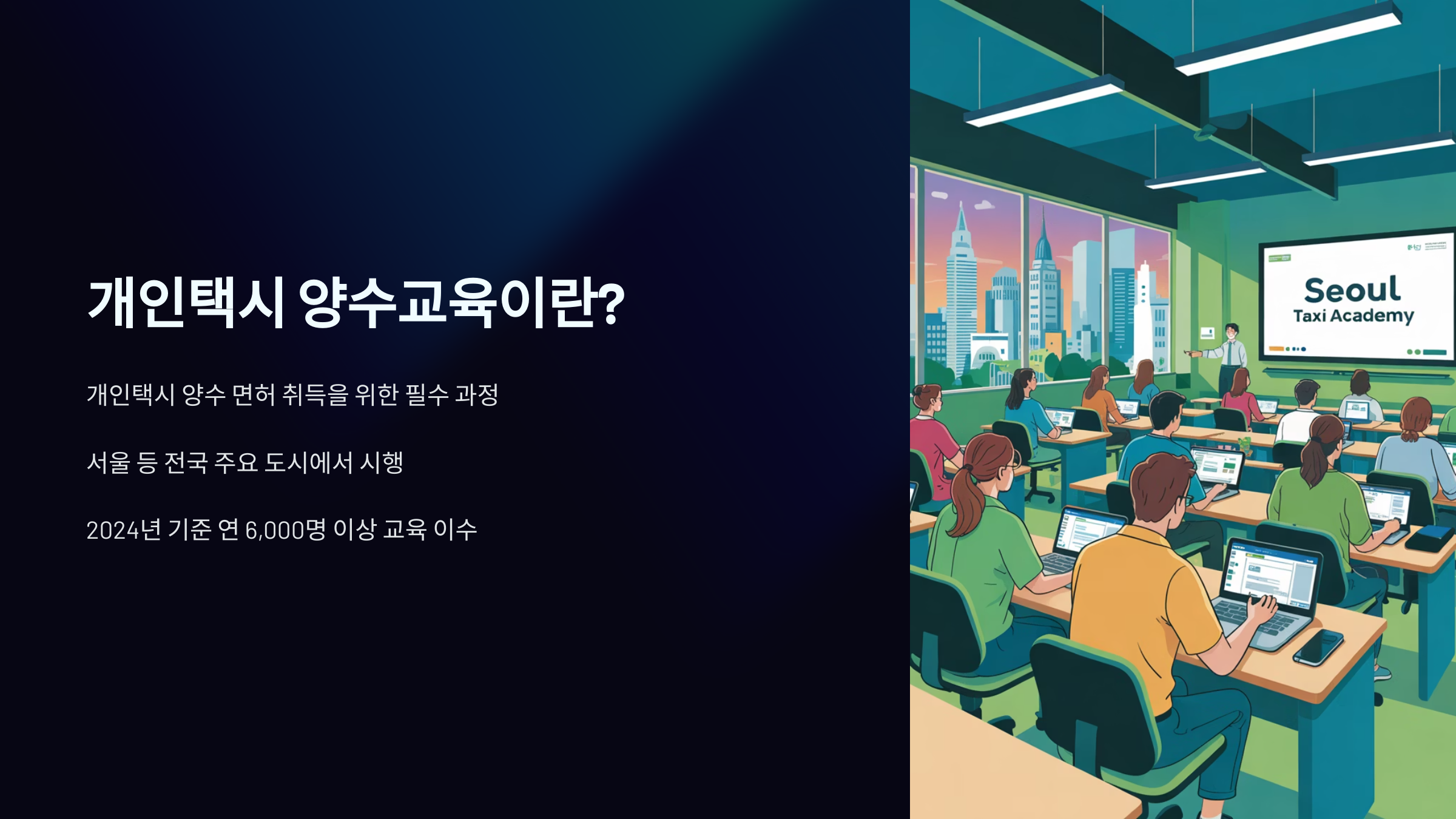 개인택시 양수교육은 기존 법인택시 기사 또는 택시 관련 종사자가 개인택시 면허를 '양수'받기 위해 반드시 이수해야 하는 교육이에요.
