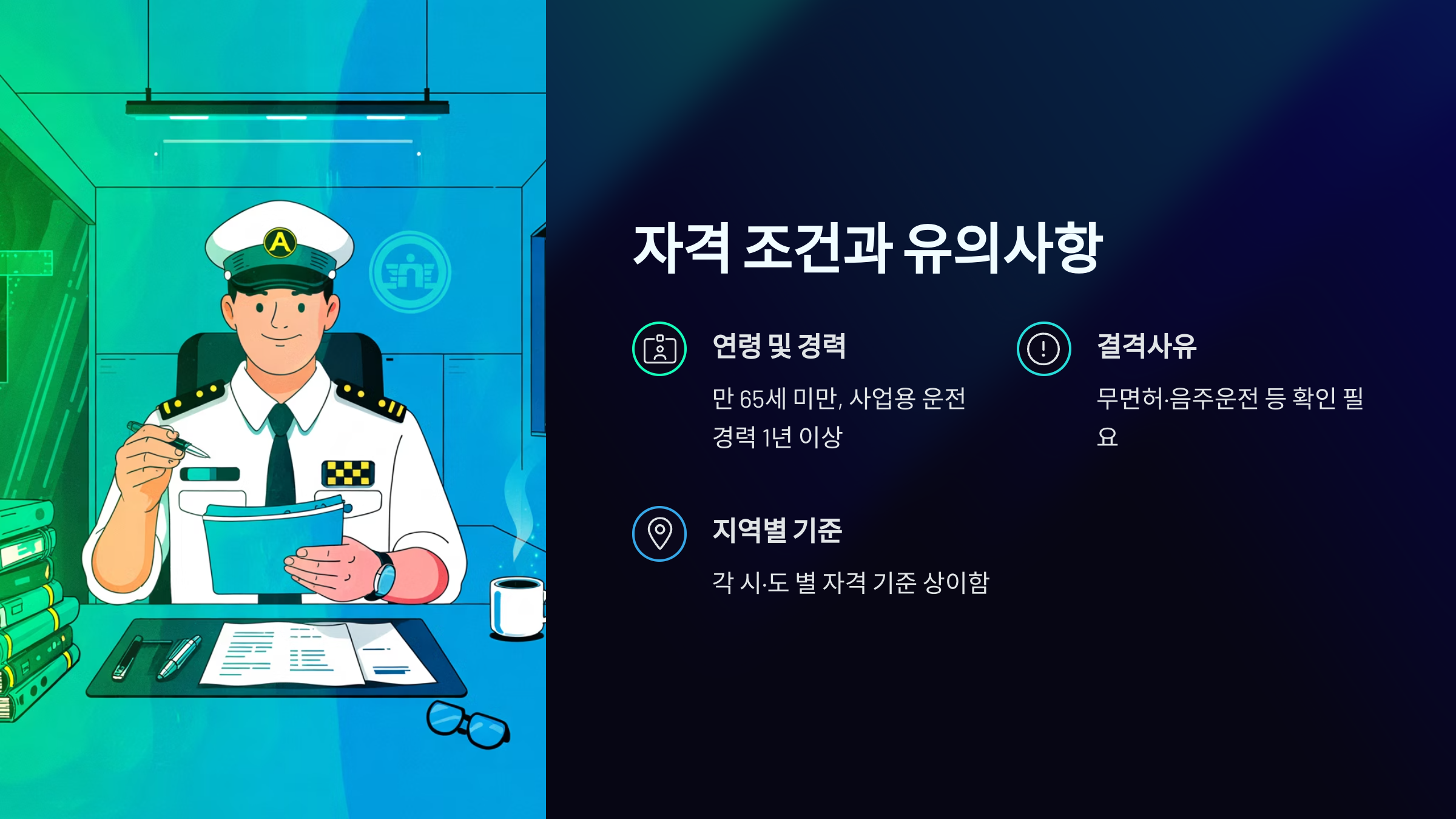 | 교통위반 | 최근 3년 간 중대한 교통법규 위반 없어야 함 |