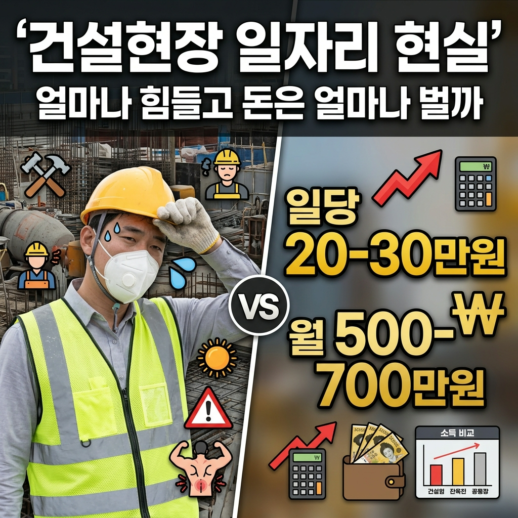건설현장 일자리는 돈을 빠르게 벌 수 있다는 이미지가 강해요. 그래서 단기간 수입을 위해 선택하는 경우도 많고, 중장년 재취업으로도 많이 들어가는 분야에요. 실제로 일당 기준으로 보면 다른 직종보다 높은 편이라 매력적으로 보이거든요. 근데 막상 들어가 보면 생각과 다른 부분이 꽤 많아요.