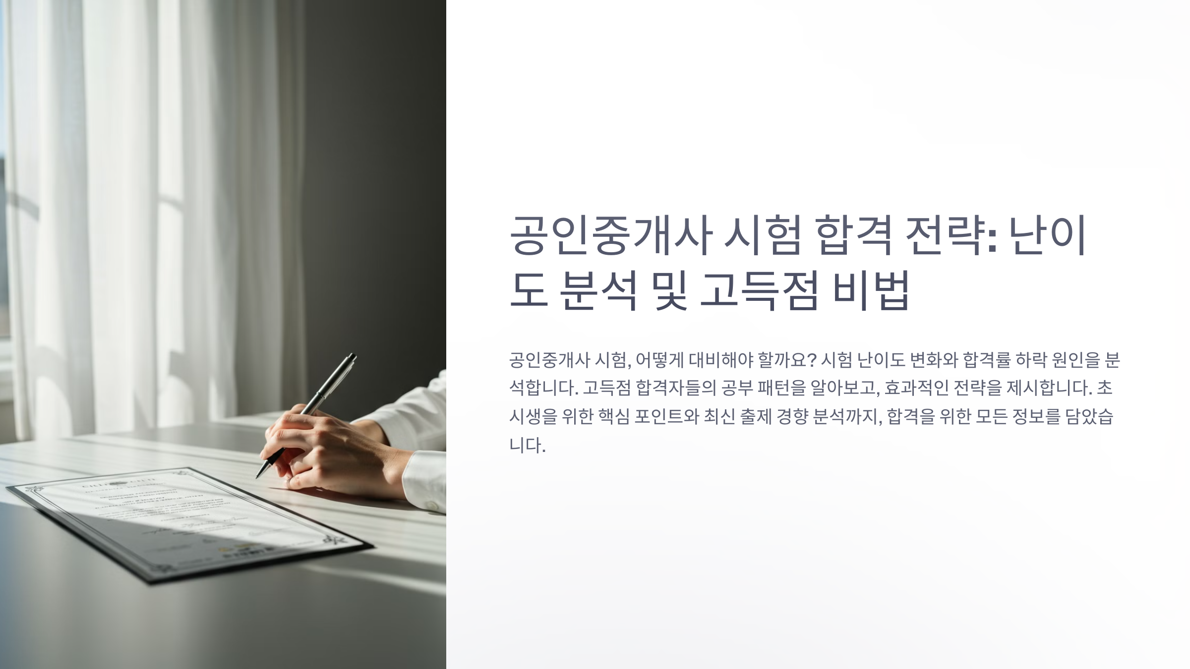 공인중개사 시험의 난이도가 점점 높아지고 있어요. 최근 몇 년간 합격률이 하락하고 있으며, 문제 유형도 변화하고 있죠.