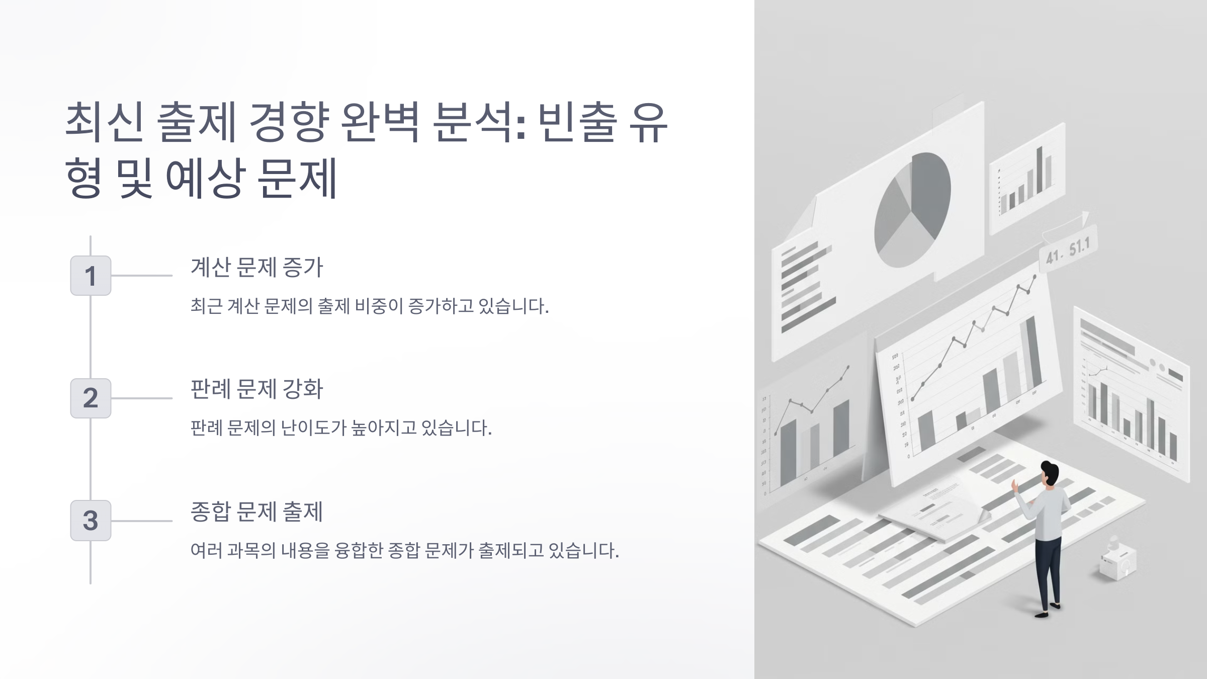 이제 단순 암기만으로는 합격이 어려워지고 있어요. 개념 이해와 실전 문제 풀이가 더욱 중요해졌어요. 특히 법 과목의 난이도가 상승하고 있어, 대비 전략을 세우는 것이 필수예요.