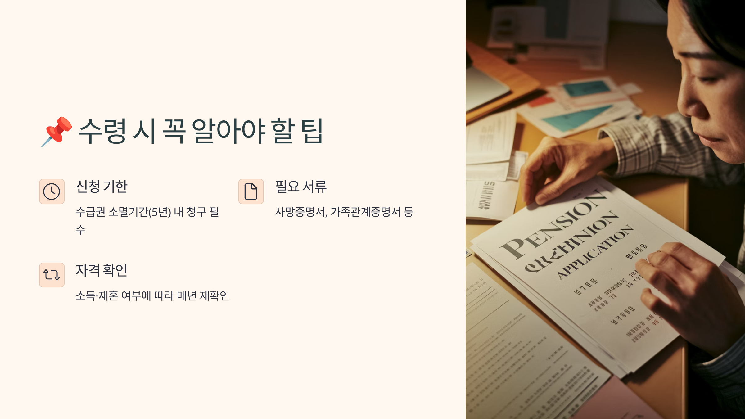 ✅ 팁 1. 사망 사실 발생 시 2년 이내 신청해야 해요! 놓치면 소급 적용이 안 돼요.