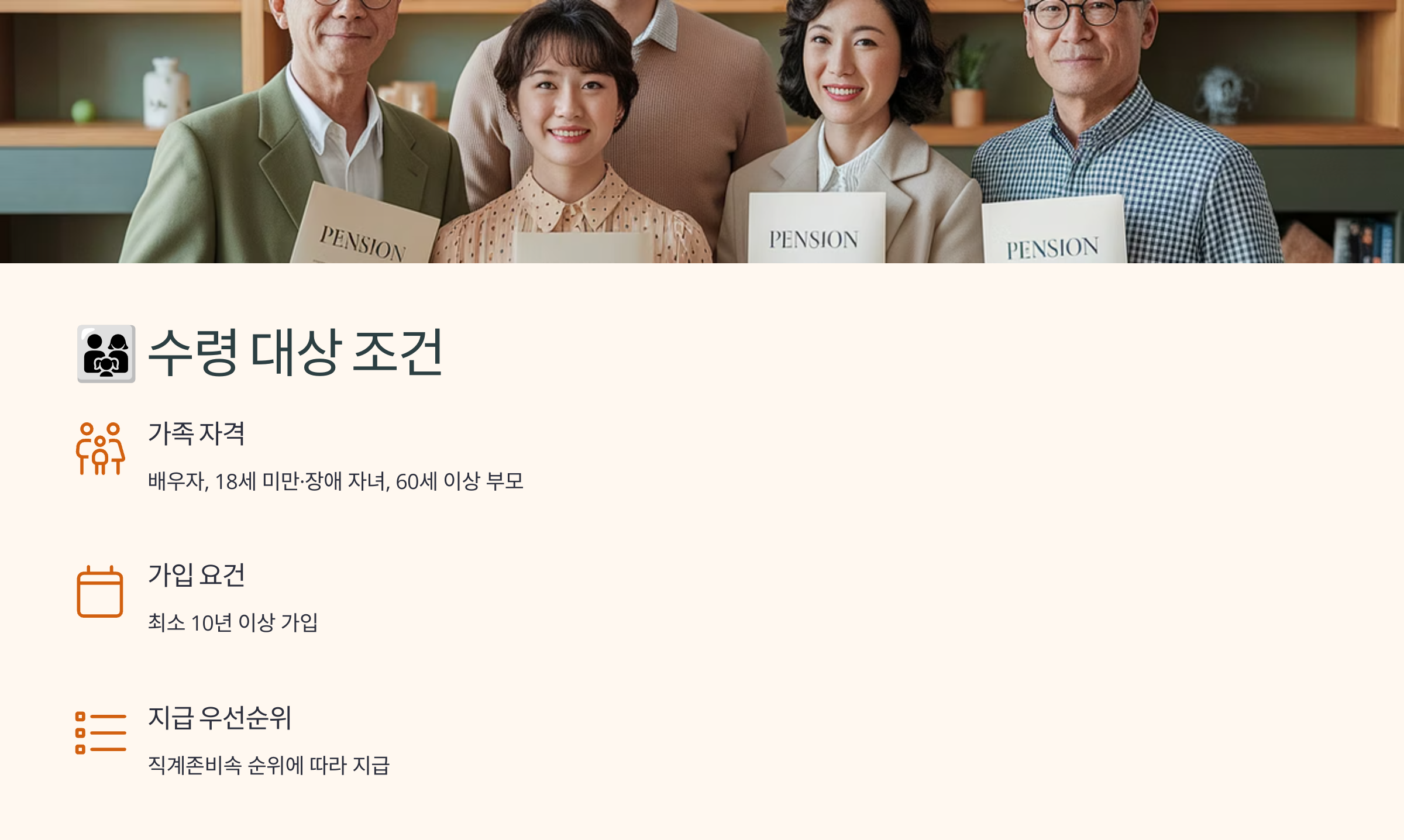 그리고 유족은 아래 순서에 따라 수급 대상이 될 수 있어요. 아래 순서가 우선이며, 상위 대상자가 없거나 조건이 안 되면 다음 순위로 넘어가요: