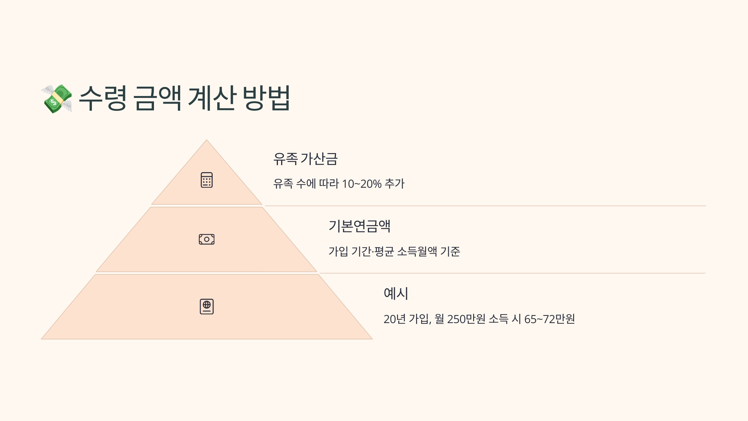 기본적으로 유족연금은 ‘기초연금’과는 달리, 가족의 소득과 무관하게 지급돼요. 하지만 연금액은 사망 당시의 가입 기간과 납부 수준에 따라 다르죠.