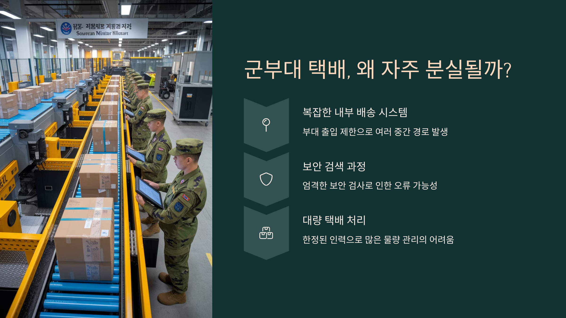 군부대는 일반적인 택배 환경과 완전히 달라요. 외부인의 출입이 통제되고, 부대 내 물류 전달 구조도 매우 복잡하거든요.