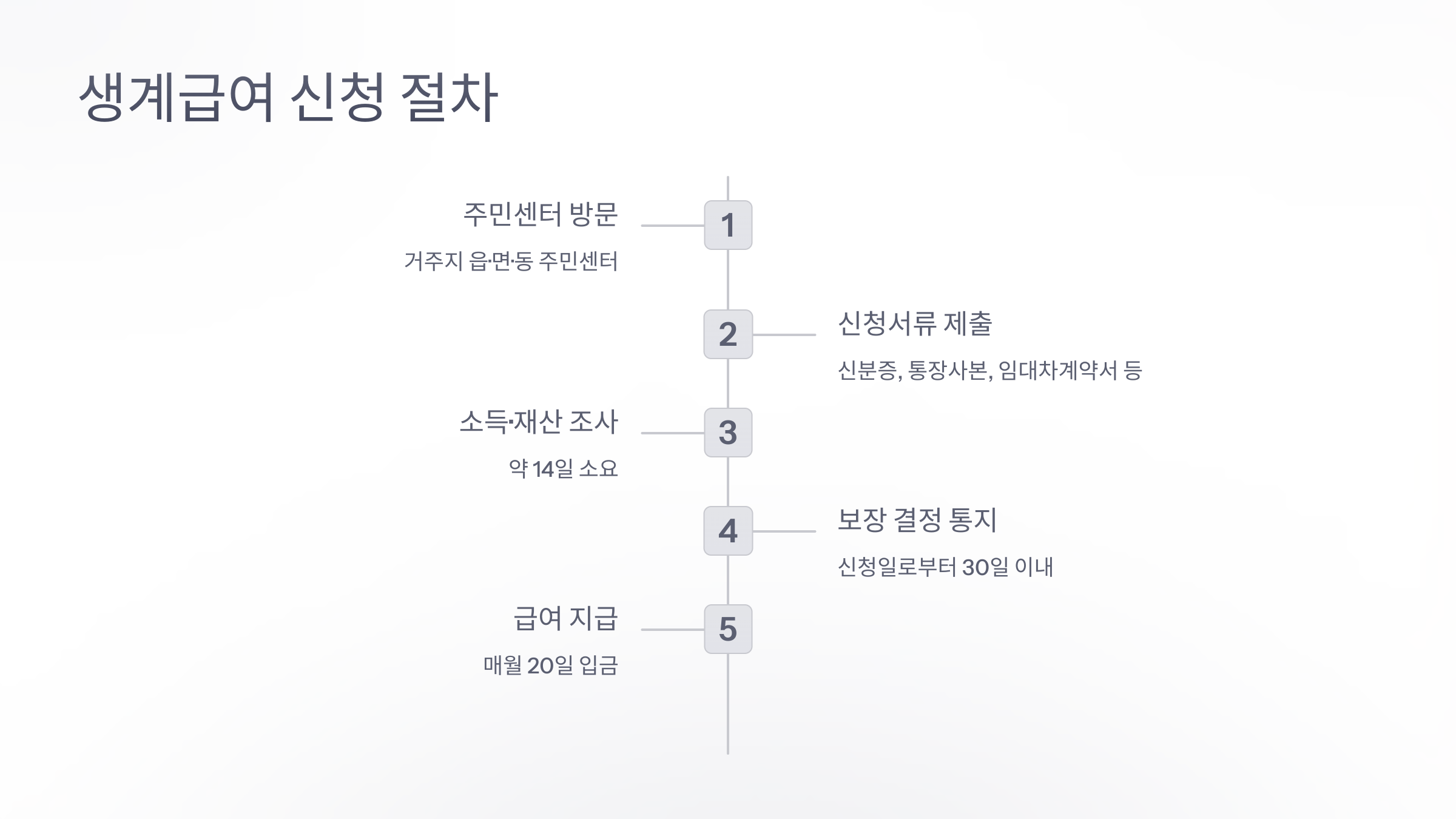생계급여를 신청하려면 주민센터(행정복지센터)를 방문해서 신청해야 해요. 온라인 신청은 불가능하니 꼭 방문해야 해요. 신청 후에는 가구의 소득과 재산 조사가 진행되고, 심사를 통과하면 지원을 받을 수 있어요. 📄