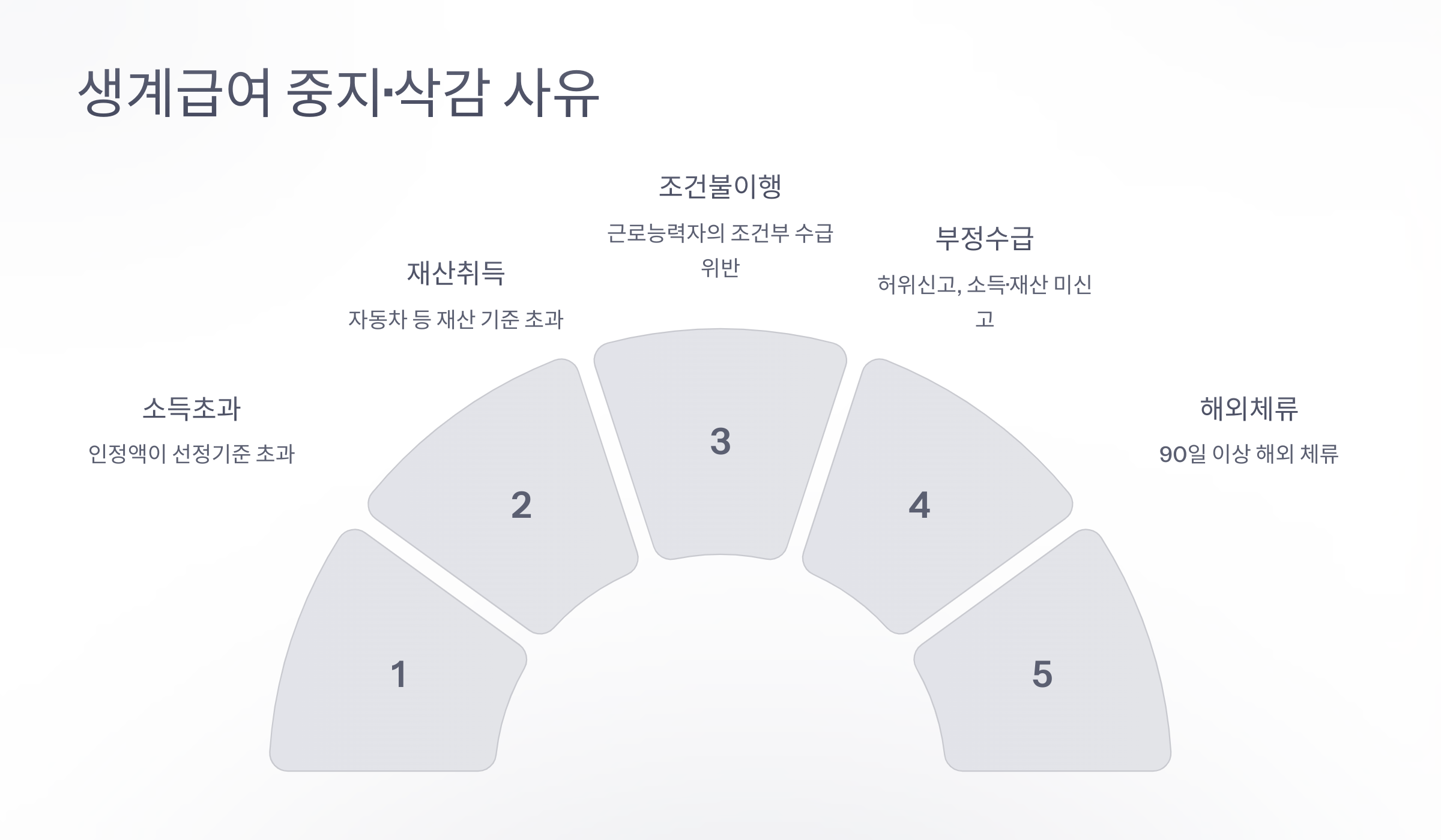 | 소득 증가 | 근로소득·사업소득 증가로 소득인정액이 기준을 초과하면 급여 중단 |