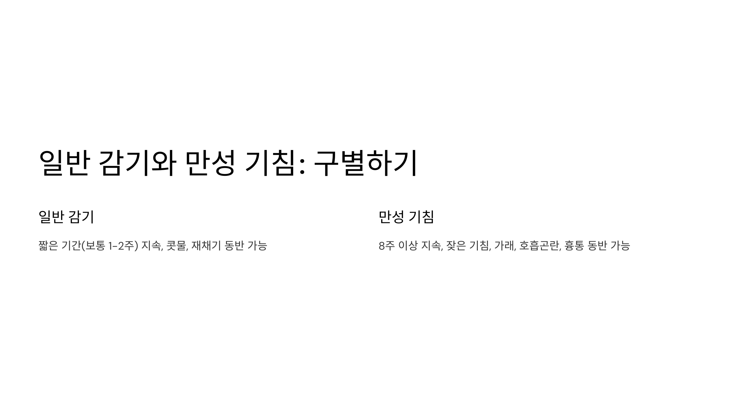 기침이 계속될 때, 단순 감기인지 다른 질병인지 구별하는 것이 중요해요. 감기는 보통 열, 콧물, 인후통과 함께 나타나고 1~2주 내에 호전돼요. 하지만 기침만 지속되거나 특정 증상이 심해진다면 다른 질환을 의심해야 해요. 🧐