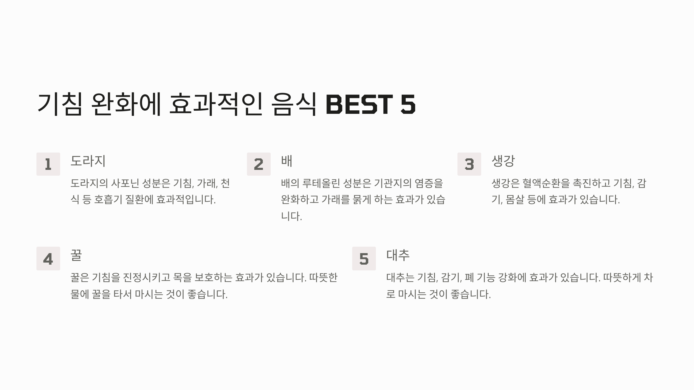 기침이 날 때는 **목을 보호하고 기관지를 촉촉하게 유지하는 음식**을 섭취하는 것이 중요해요. 자연적인 방법으로 기침을 완화하는 데 도움이 되는 **베스트 5가지 음식**을 소개할게요!