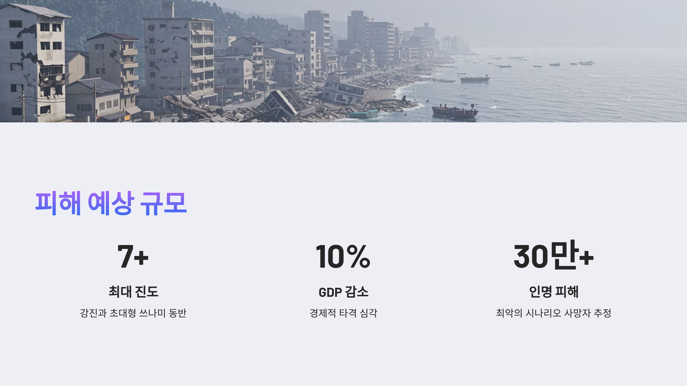 | 지역 | 예상 진도 | 쓰나미 높이 | 도달 시간 | 위험도 |