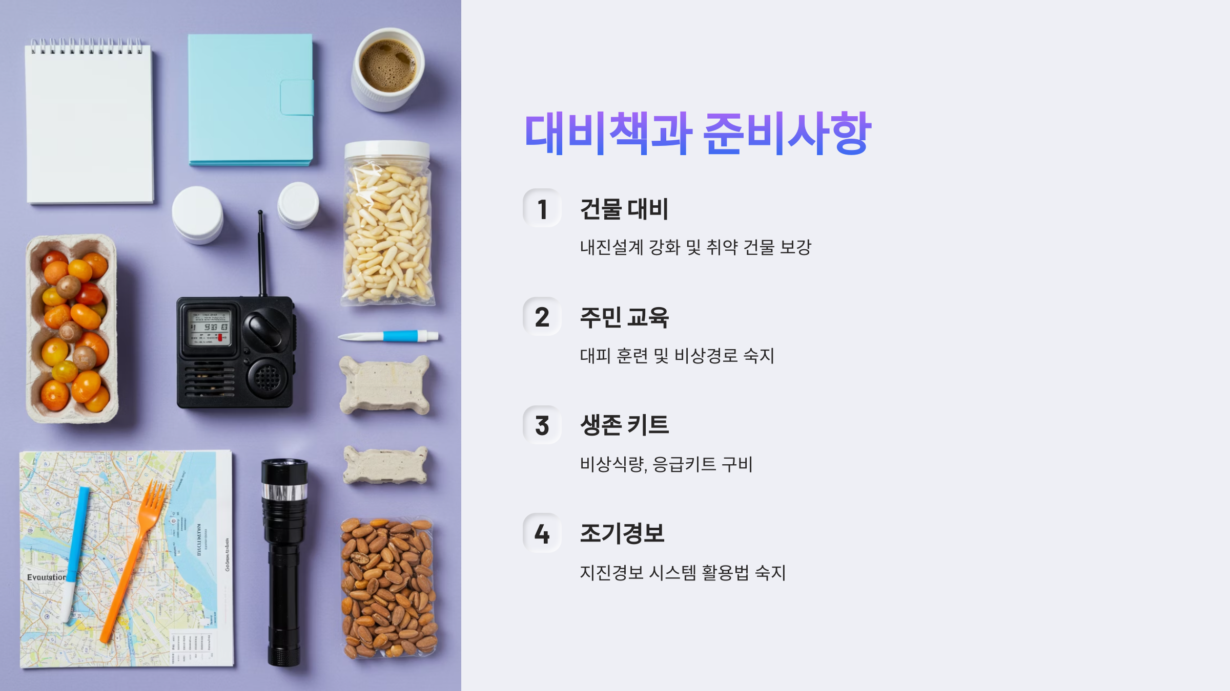 | 기타 필수품 | 현금, 중요서류, 작업용 장갑 | 적정량 | 정기 업데이트 |