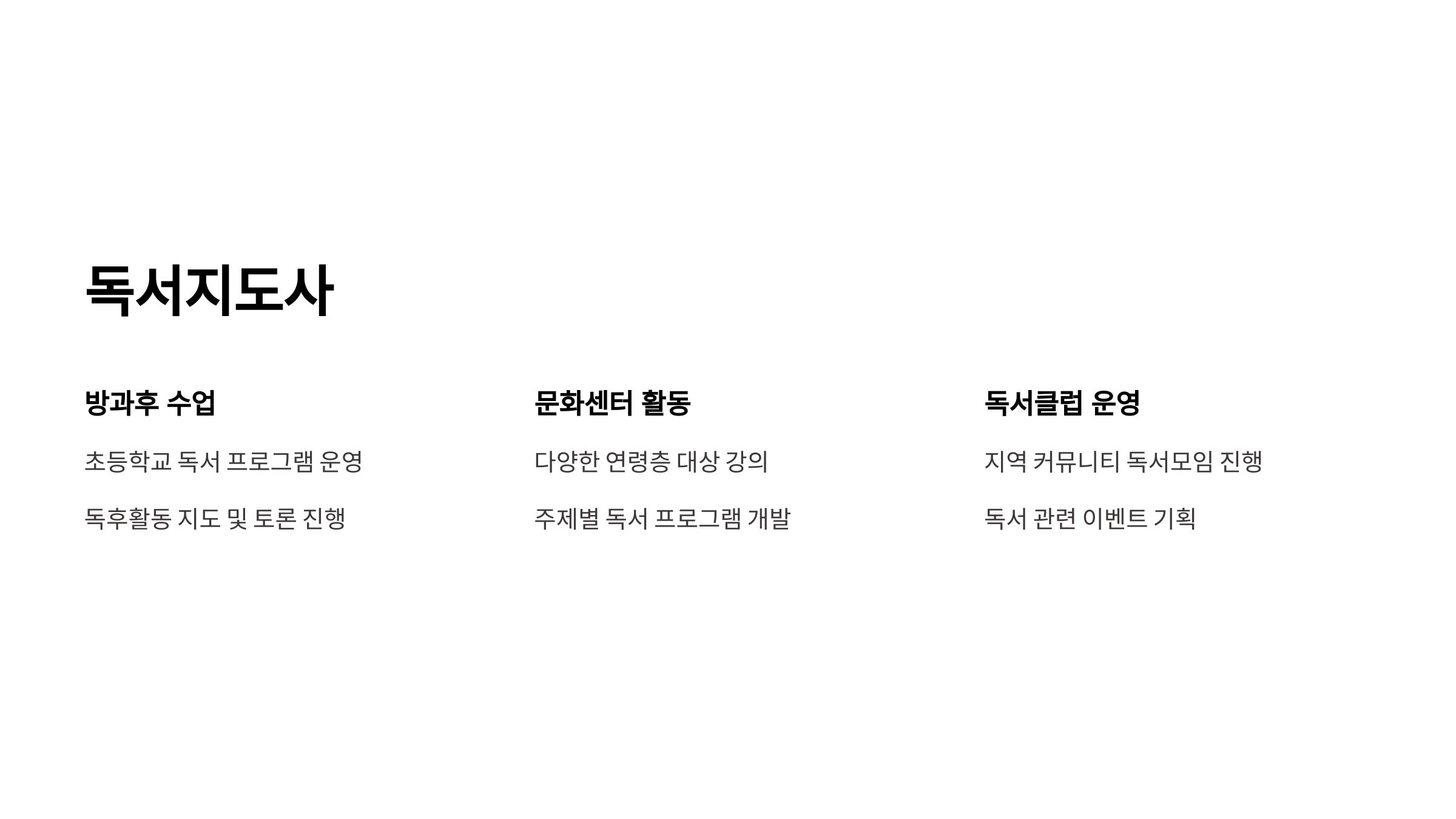| 필요 기술 | 독서 지도법, 아동 교육, 커뮤니케이션 능력 |
