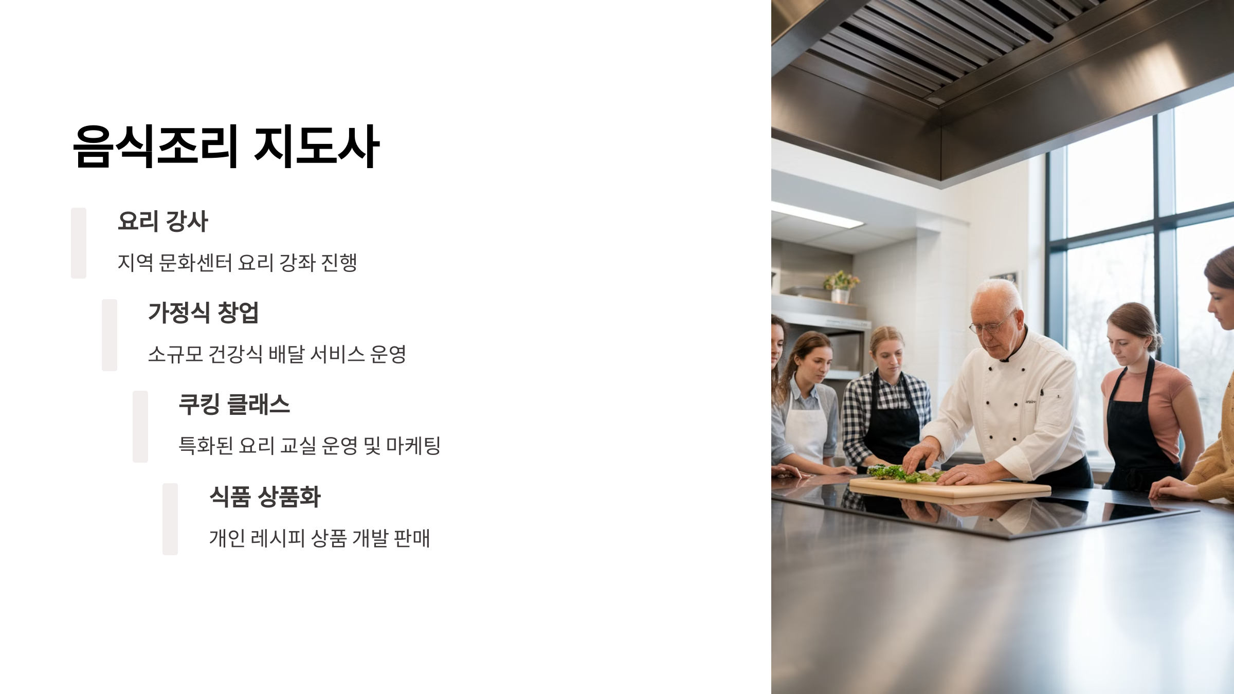 음식조리 지도사는 요리 기술을 가르치거나, 가정식 창업을 준비하는 사람들을 돕는 전문가예요. 문화센터 강사, 요리 학원 강사, 1인 온라인 클래스 운영 등 다양한 방식으로 활동할 수 있어요.