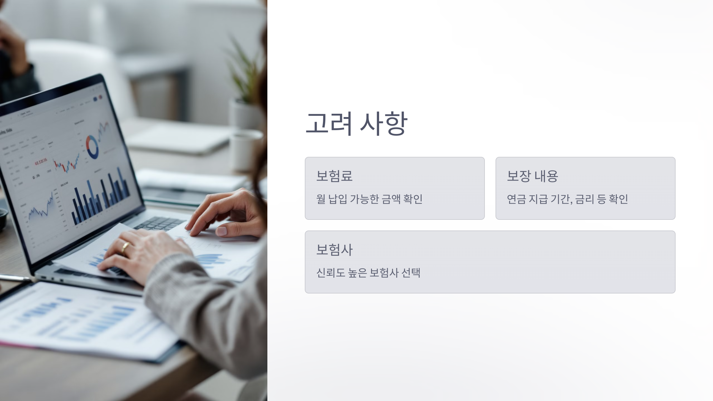 셋째, 보험료 납입 기간과 금액도 신중히 결정해야 해요. 지나치게 높은 보험료는 현재의 생활에 부담을 줄 수 있기 때문에 적정 수준으로 설정하는 것이 중요해요. 장기적으로 부담 없는 금액을 설정해야 꾸준히 납부할 수 있답니다.