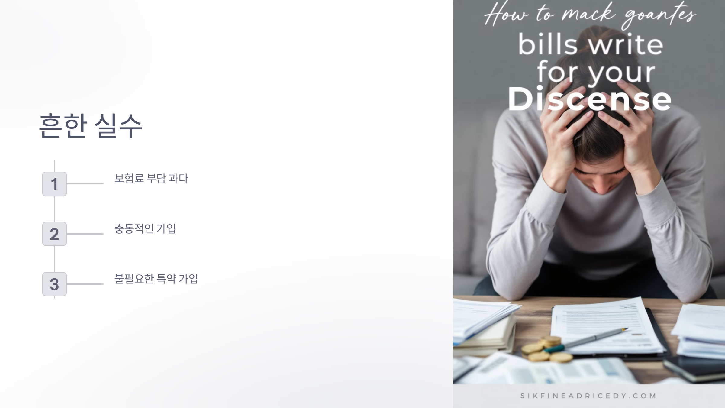두 번째는 자신의 재정 상태를 고려하지 않은 채 과도한 보험료를 설정하는 거예요. 무리한 금액은 나중에 부담이 되어 납입 중단으로 이어질 수 있어요. 현실적인 예산 안에서 무리 없는 금액을 설정하세요.