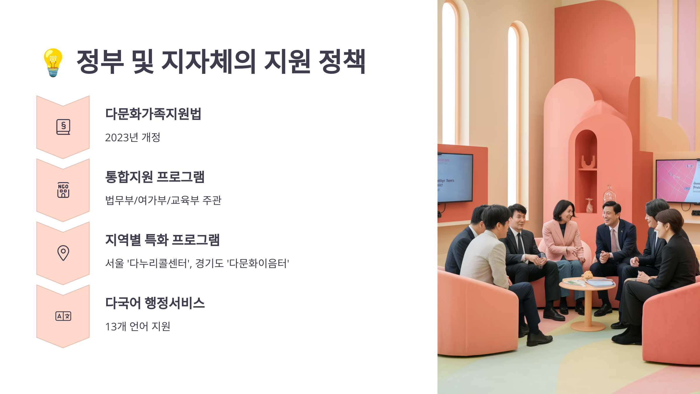 지방자치단체도 적극 나서고 있어요. 예를 들어, 경기도에서는 ‘다문화가족 한국어 프로그램’, 서울시는 ‘다문화 아동 심리치료 지원’ 등 지역 특성을 반영한 맞춤형 정책을 운영 중이에요.