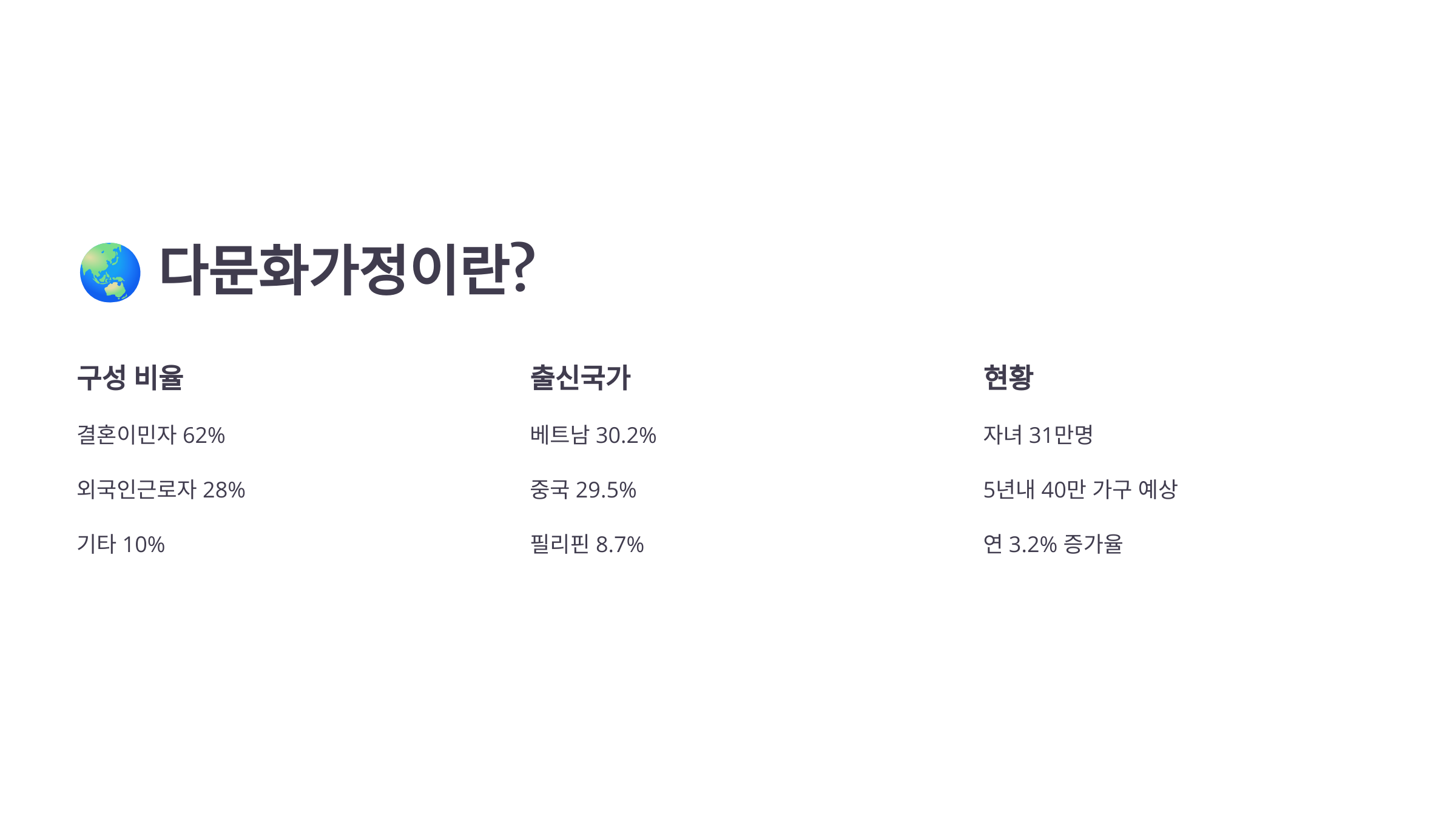 🔍 수치는 매년 증가하고 있어요. 사회 전반에서 다문화가정을 포용하는 방향으로 정책이 전환되고 있다는 걸 보여주는 지표랍니다.