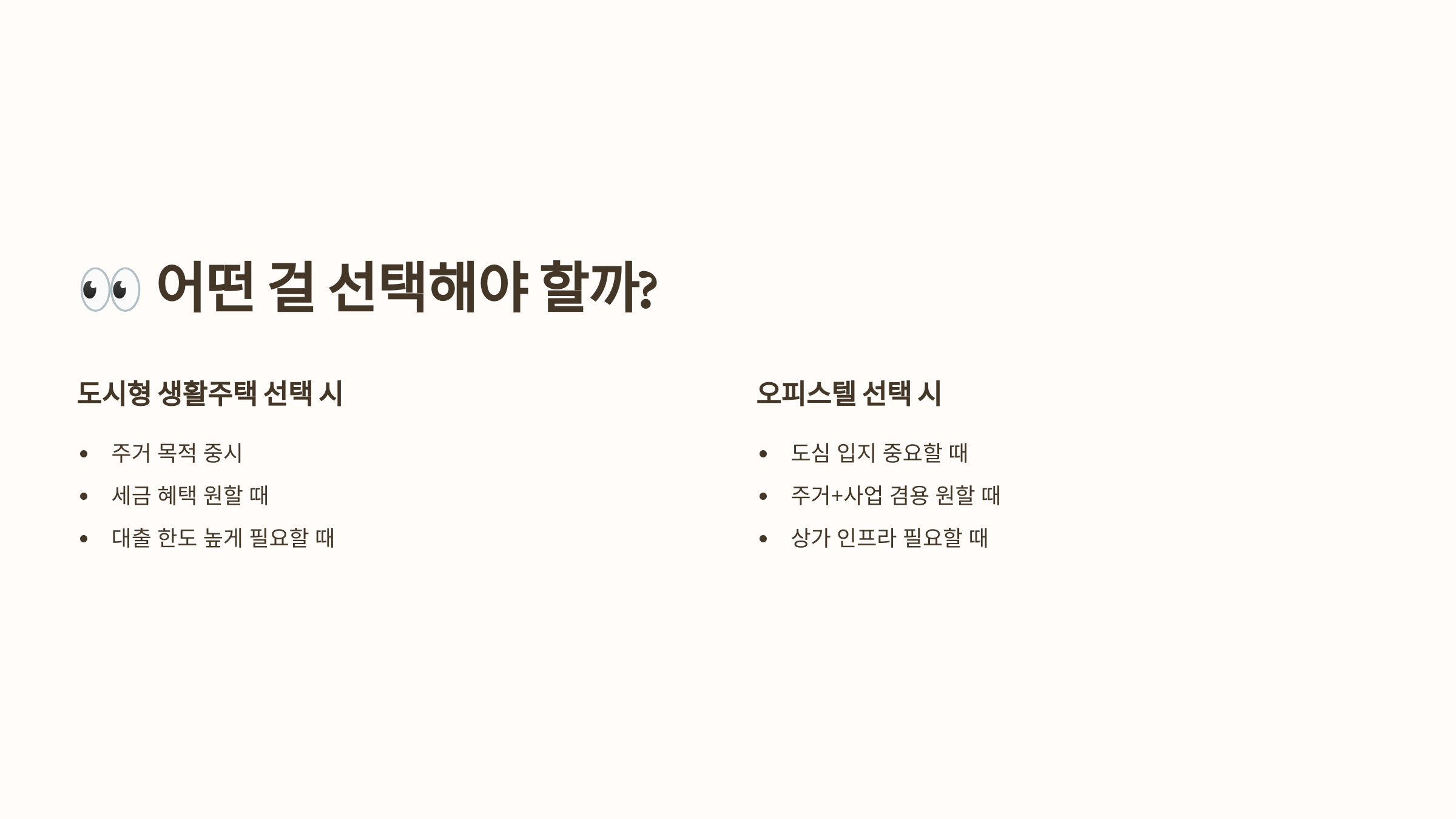이 표를 보면 어떤 점이 나한테 더 중요한지 쉽게 판단할 수 있어요. 실거주 목적이라면 도시형 생활주택, 세금 회피나 투자 목적이라면 오피스텔이 유리할 수도 있죠.