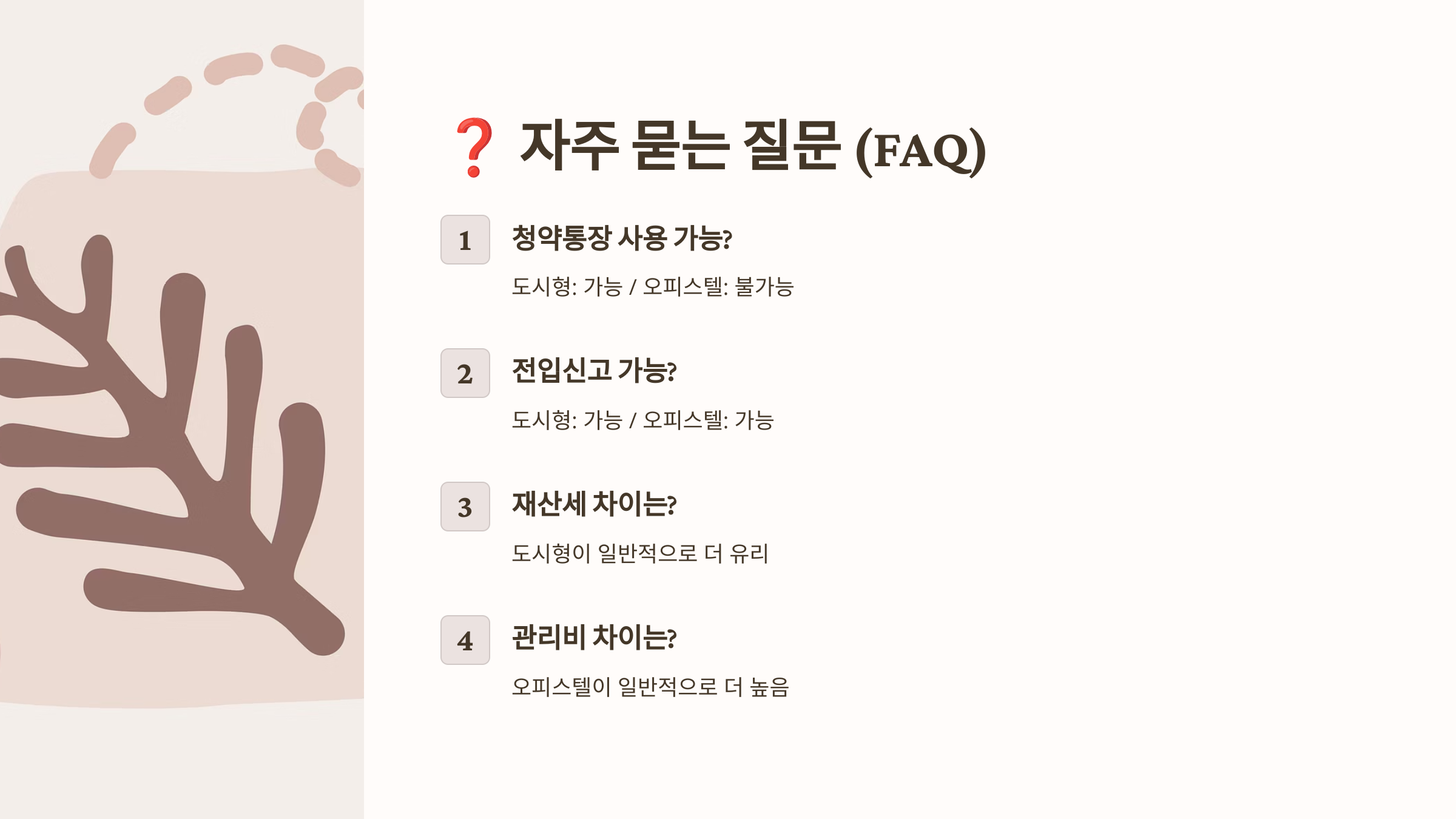 A8. 청약을 준비하고 무주택을 유지하고 싶다면 오피스텔이 유리해요. 도시형 생활주택은 주택으로 잡히기 때문에 청약 자격에 제한이 생길 수 있어요.