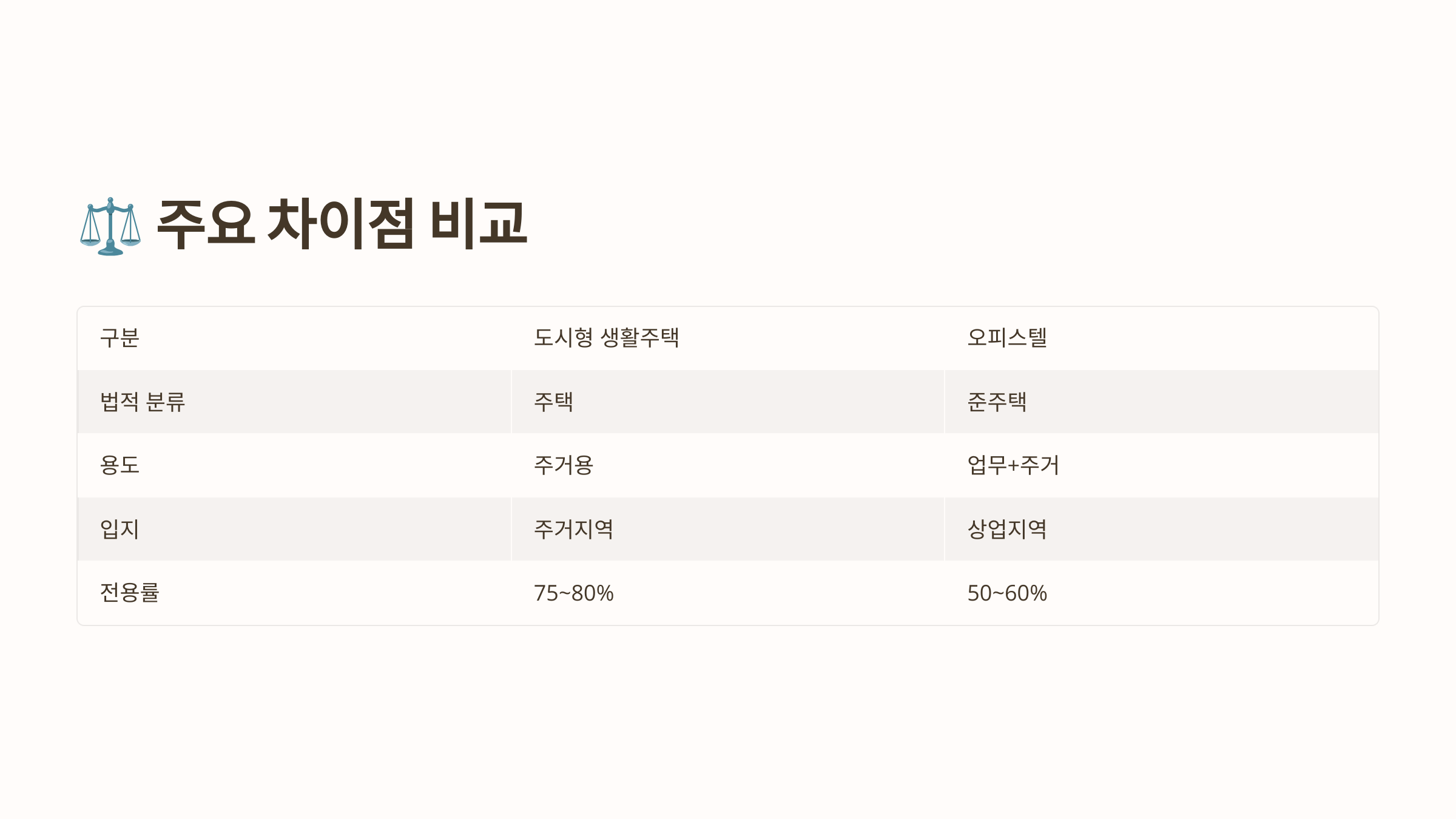 | 항목 | 도시형 생활주택 | 오피스텔 |