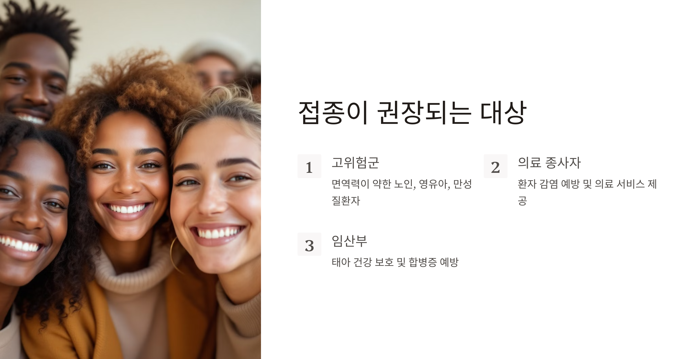 또한, 집단생활을 하는 환경에 있는 사람들에게도 접종이 권장돼요. 학교, 군대, 요양원 등 밀접한 접촉이 잦은 곳에서는 바이러스가 빠르게 퍼질 가능성이 높기 때문에 예방접종이 필요하답니다.