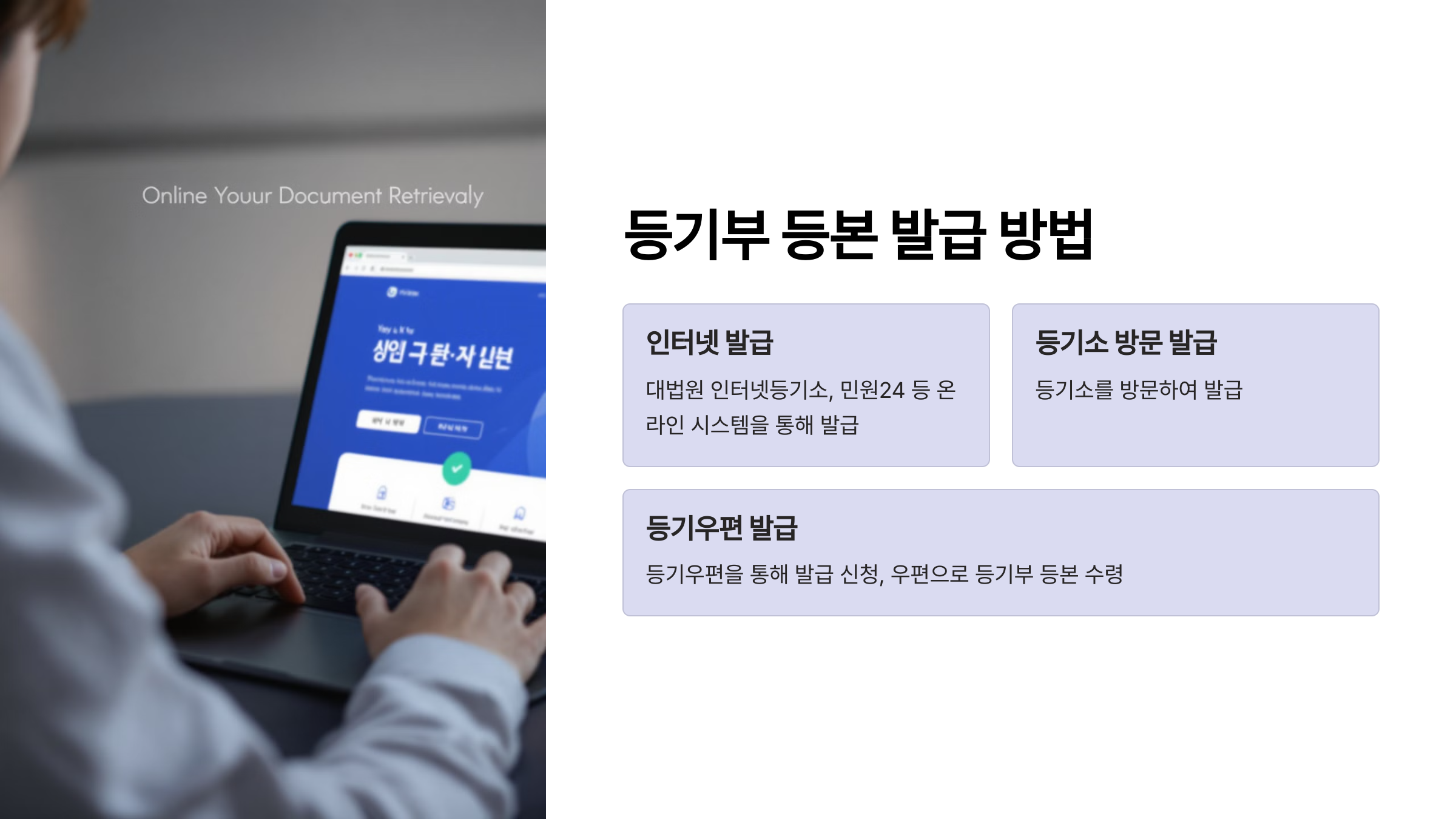 등기부 등본은 온라인과 오프라인 두 가지 방법으로 발급받을 수 있습니다. 두 방법 모두 간단한 절차를 통해 신속하게 발급받을 수 있으며, 각 방법의 상세 절차는 다음과 같습니다.