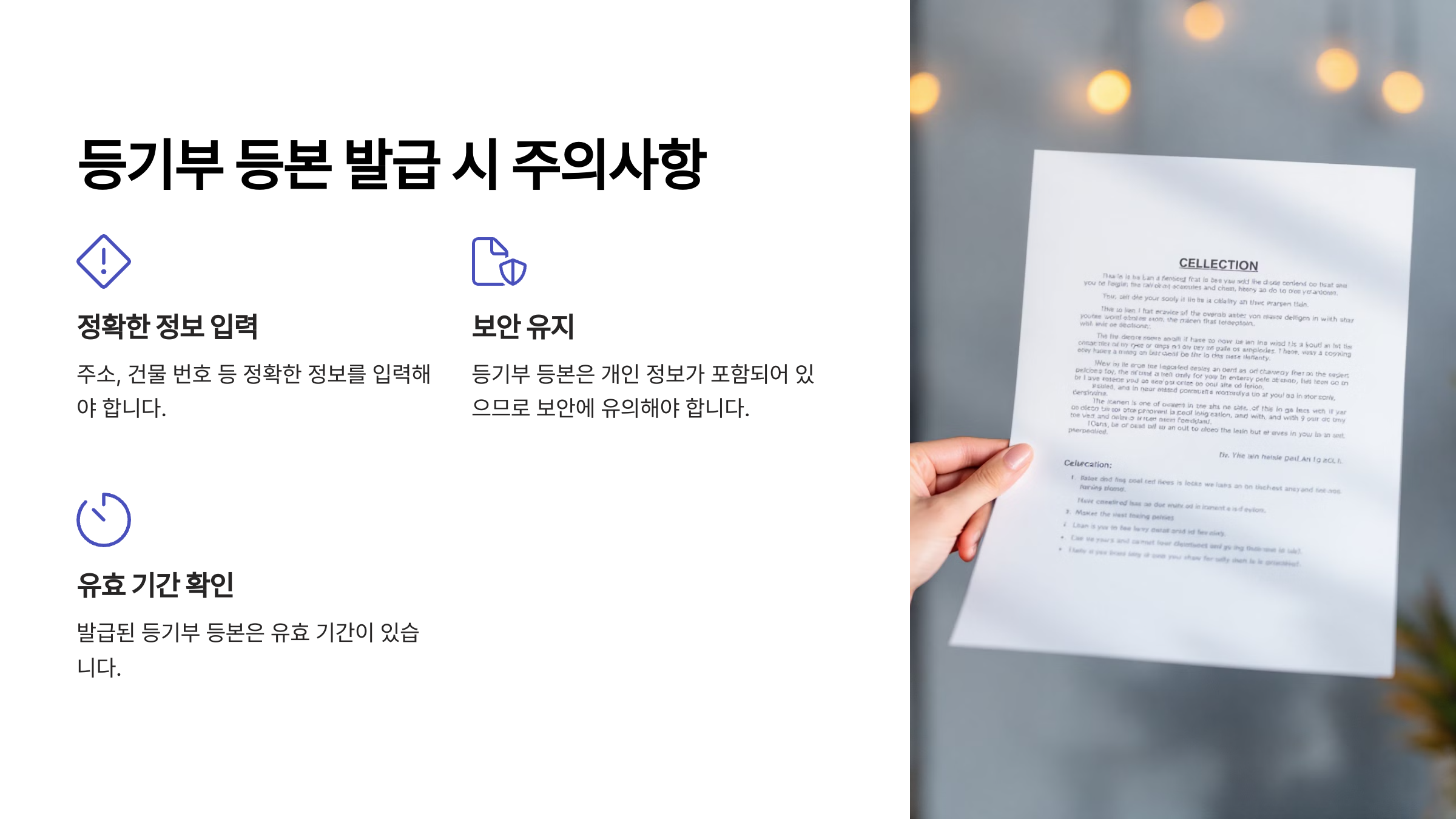 이 가이드를 통해 누구나 등기부 등본 발급을 쉽게 진행할 수 있을 것입니다.