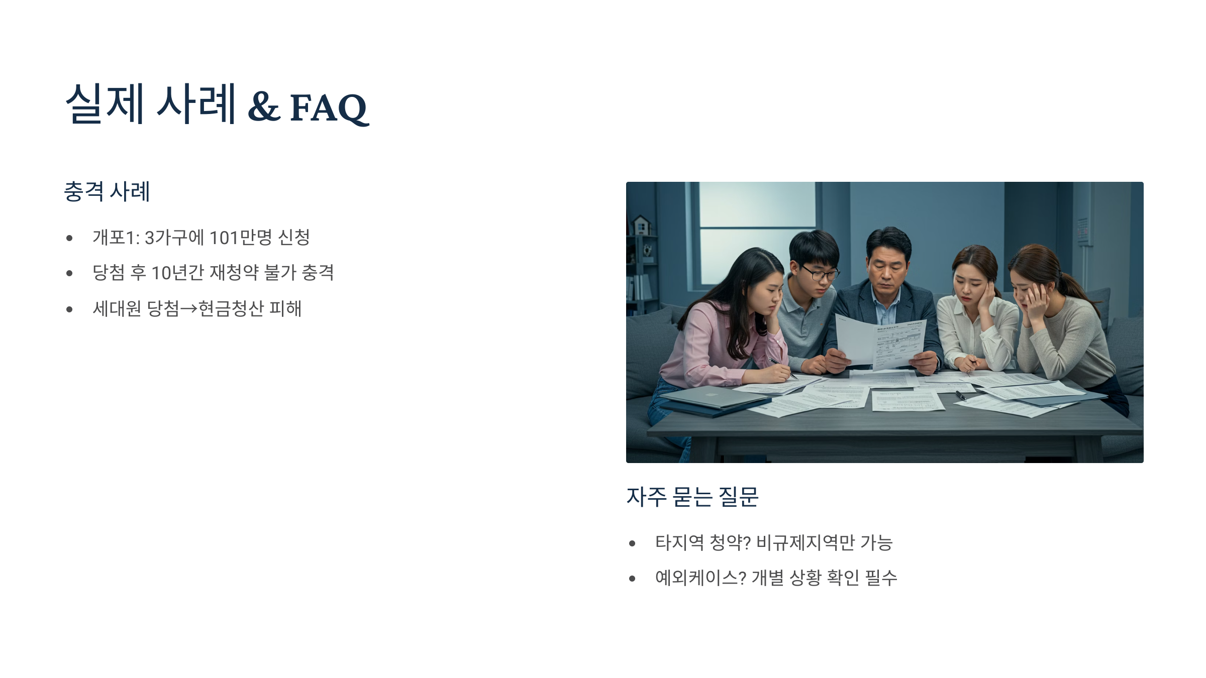 세 번째 사례는 특별공급과 관련된 경우예요. 이씨는 2021년 무순위 청약 당첨으로 재당첨 제한 중이었지만, 2024년 둘째 아이가 태어나면서 신혼부부 특별공급 자격이 생겼어요. 특별공급은 무순위 청약과 별개 제도이기 때문에 재당첨 제한에 관계없이 청약할 수 있었고, 결국 당첨되어 더 넓은 집으로 이사할 수 있게 되었답니다. 이런 사례는 가족 상황 변화에 따른 새로운 기회가 생길 수 있음을 보여줘요.