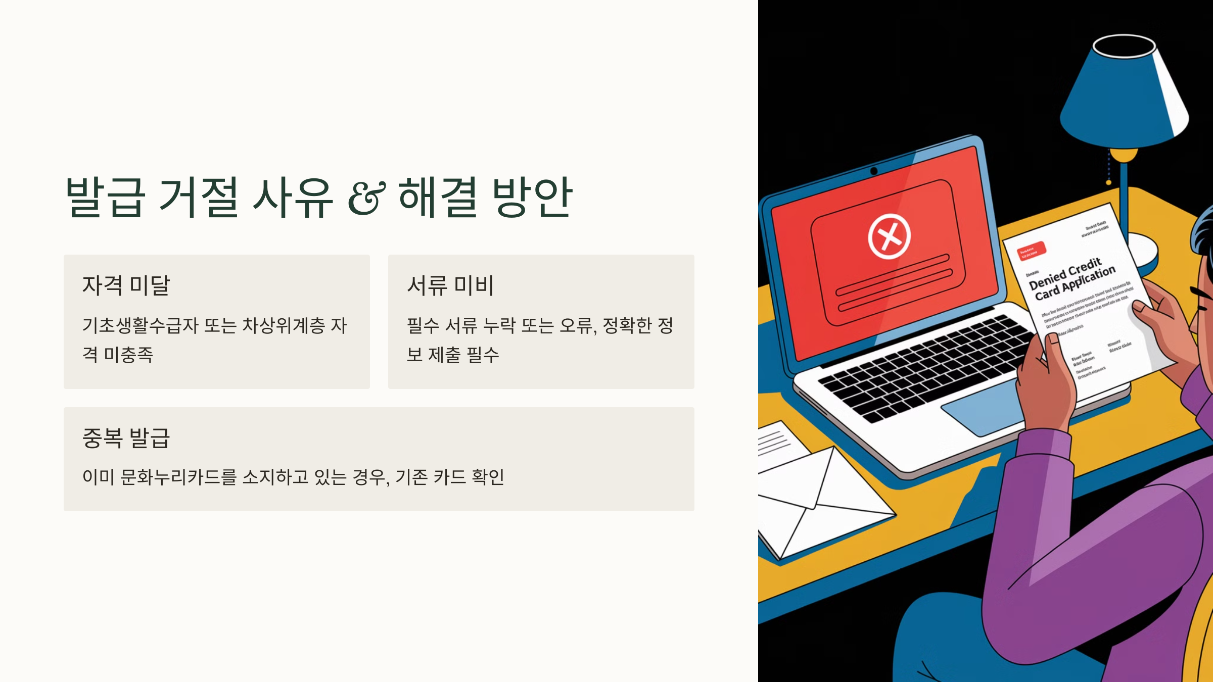 문화누리카드를 신청했는데 발급이 거절됐다면 당황스럽겠죠? 😥 거절되는 주요 이유와 해결 방법을 알려드릴게요!
