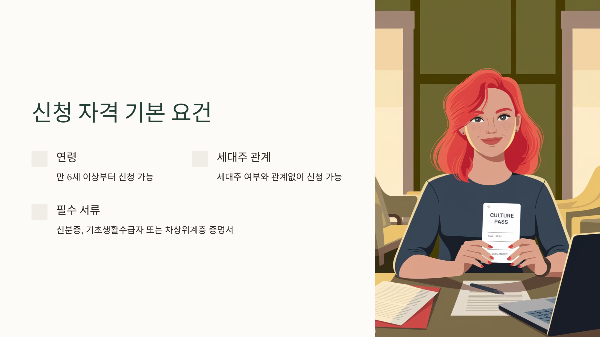 문화누리카드를 받으려면 단순히 소득 기준만 충족한다고 끝이 아니에요! 연령 제한이 있는지, 세대주 여부가 중요한지, 기타 필수 요건이 있는지 자세히 살펴볼게요. 🔍