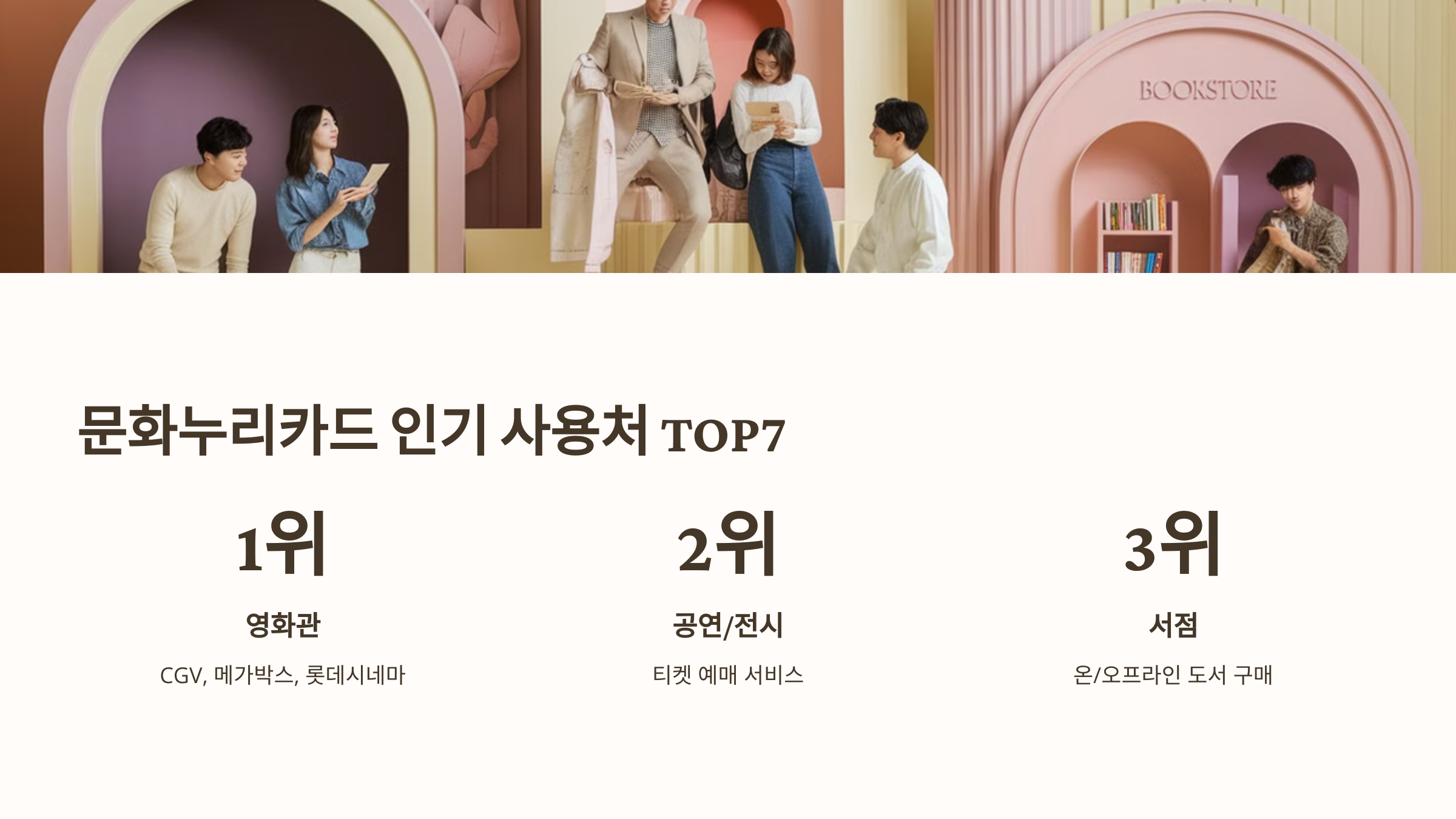그래서 준비했어요! 지금부터 문화누리카드 인기 사용처 BEST 7 알려드릴게요. 👇