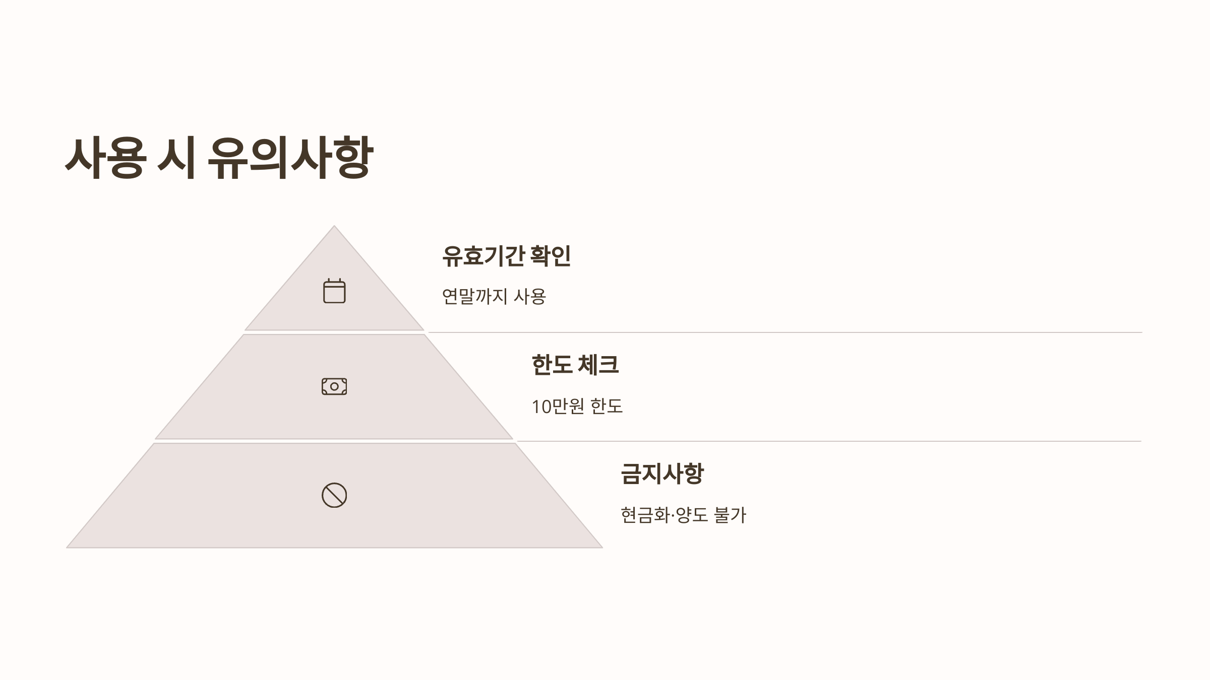 1️⃣ 연간 예산 소진 마감: 매년 12월 31일까지 사용하지 않으면 금액이 소멸돼요. 이월이나 환불은 안 돼요.