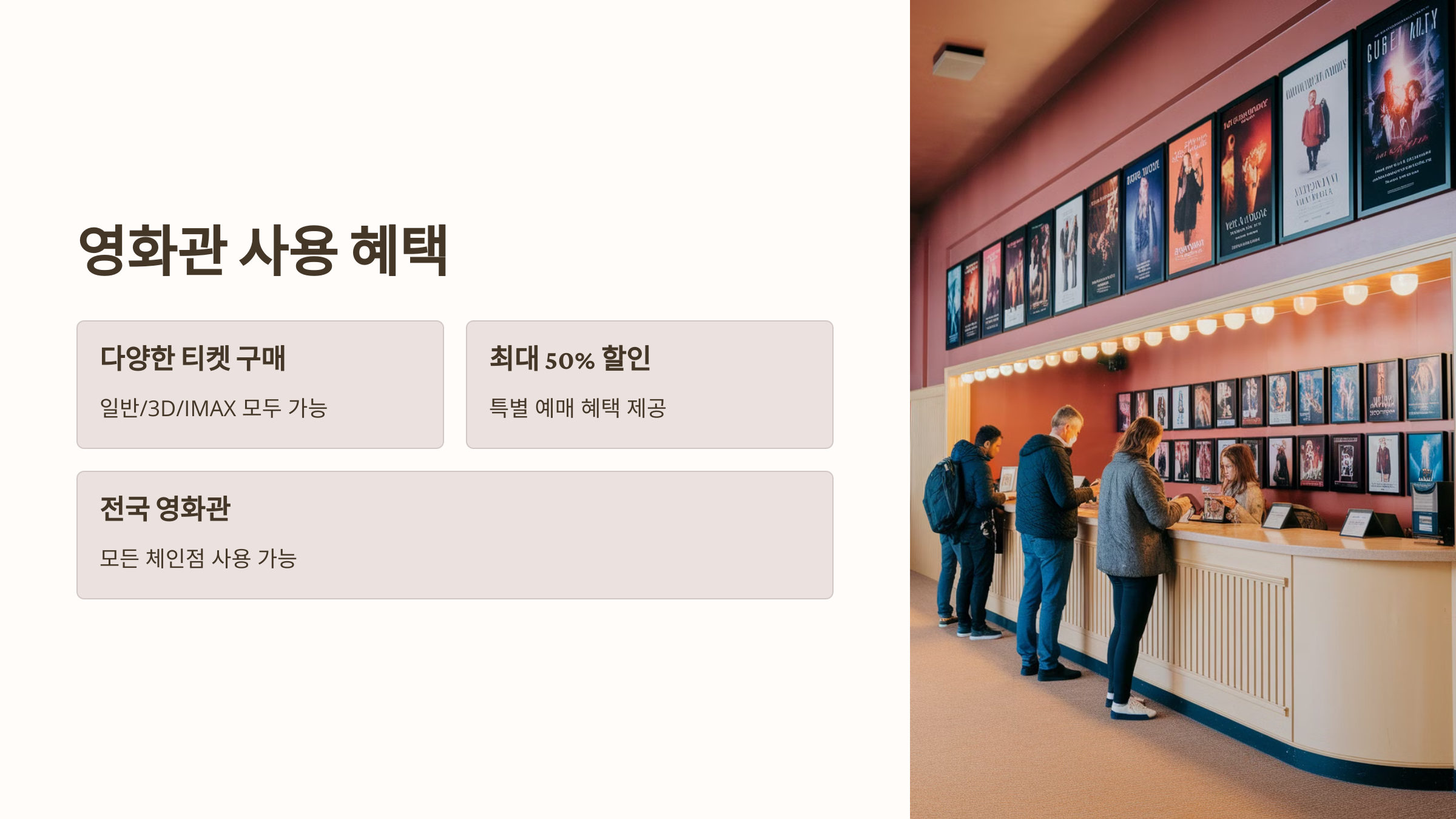 대표적인 사용처는 CGV, 롯데시네마, 메가박스예요. 전국 대부분 지점에서 사용 가능하고, 티켓 발권기에서 카드로 결제하면 바로 적용돼요.