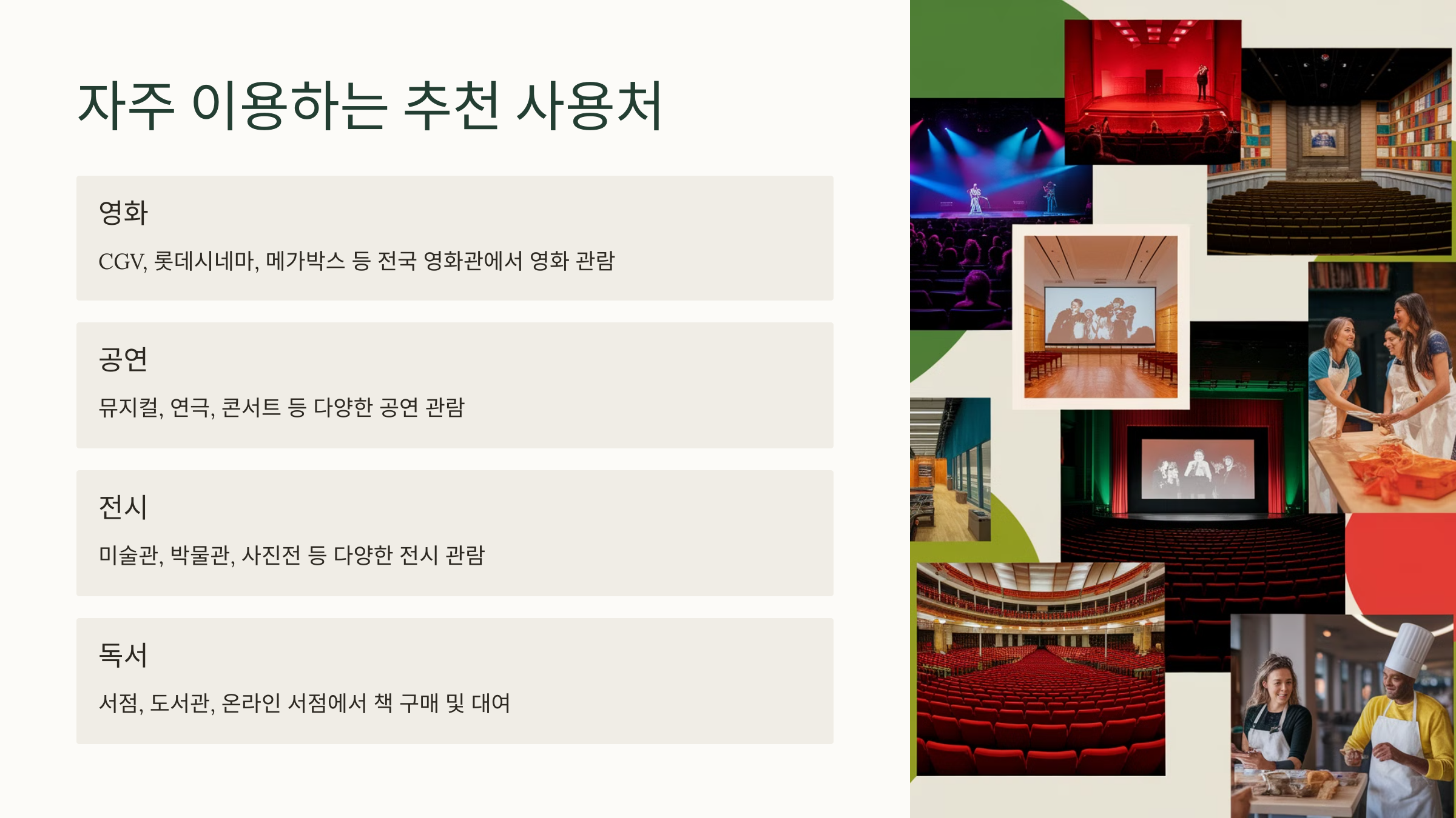 문화누리카드는 다양한 곳에서 사용할 수 있지만, 많은 이용자가 선호하는 인기 사용처가 있어요. 특히 문화·여행·체육 분야에서 접근성이 좋고 혜택을 최대한 활용할 수 있는 곳들을 정리해 봤어요! 🎟️