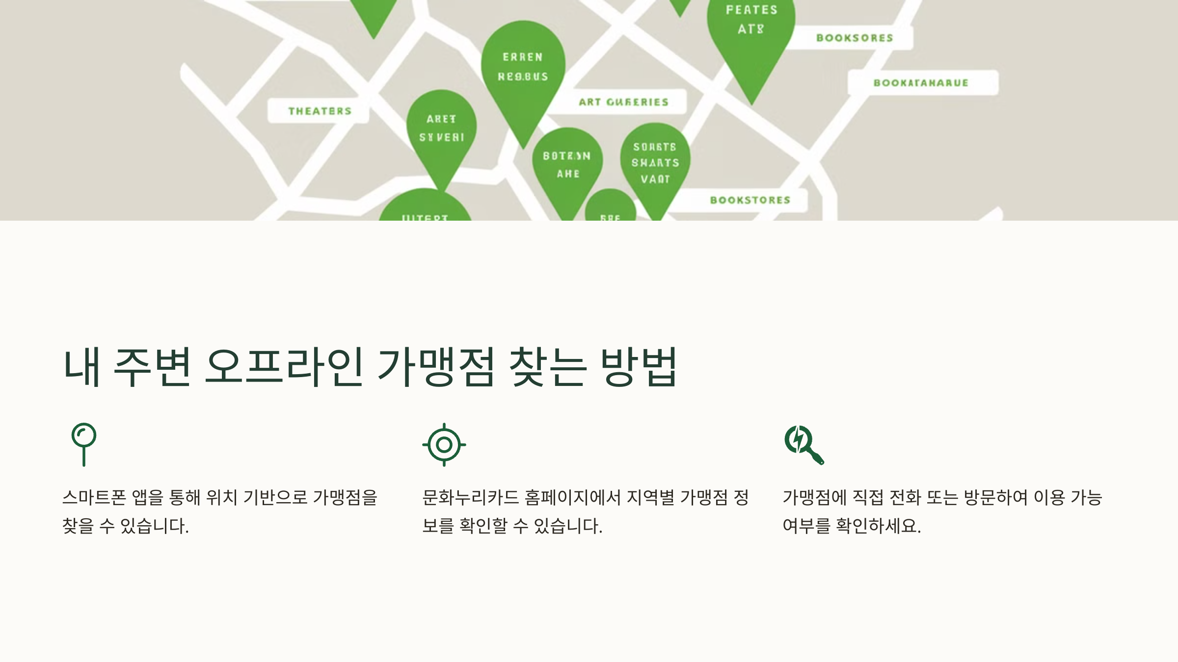 - 문화누리카드 고객센터(☎1544-3412)로 전화하여 사용 가능 매장 확인
