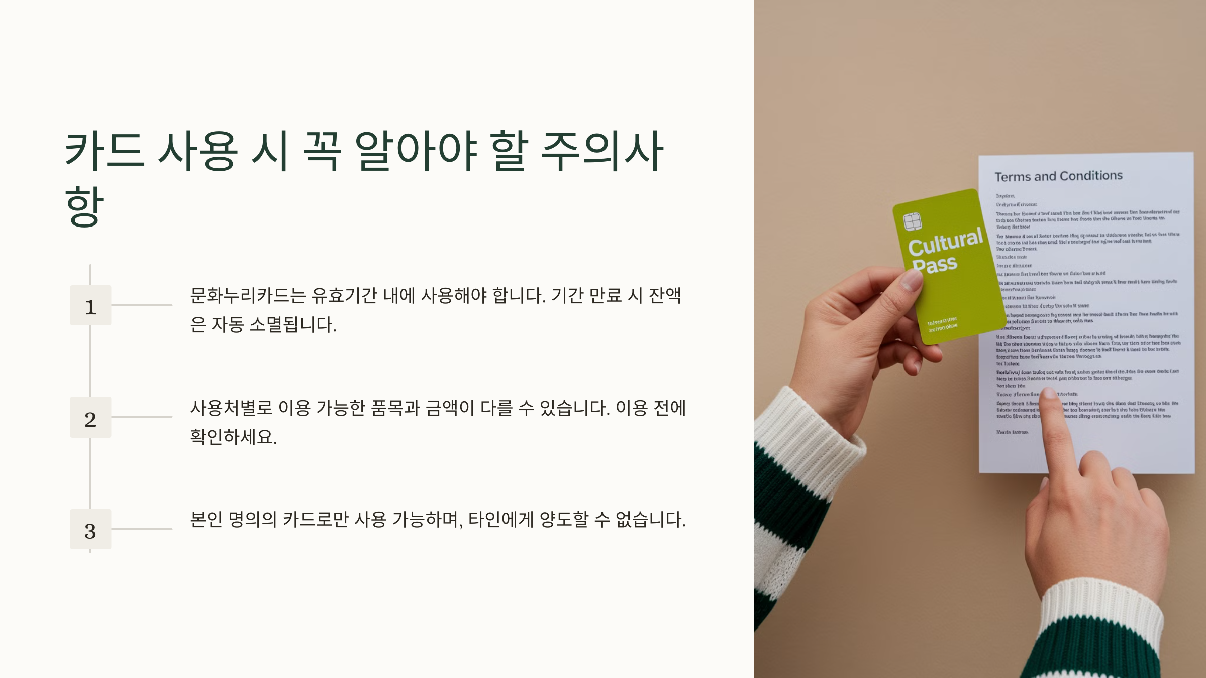 문화누리카드는 특정 용도로만 사용 가능하며, 일부 제한사항이 있어요. 사용 전에 꼭 확인해야 할 주요 유의사항을 정리했어요!