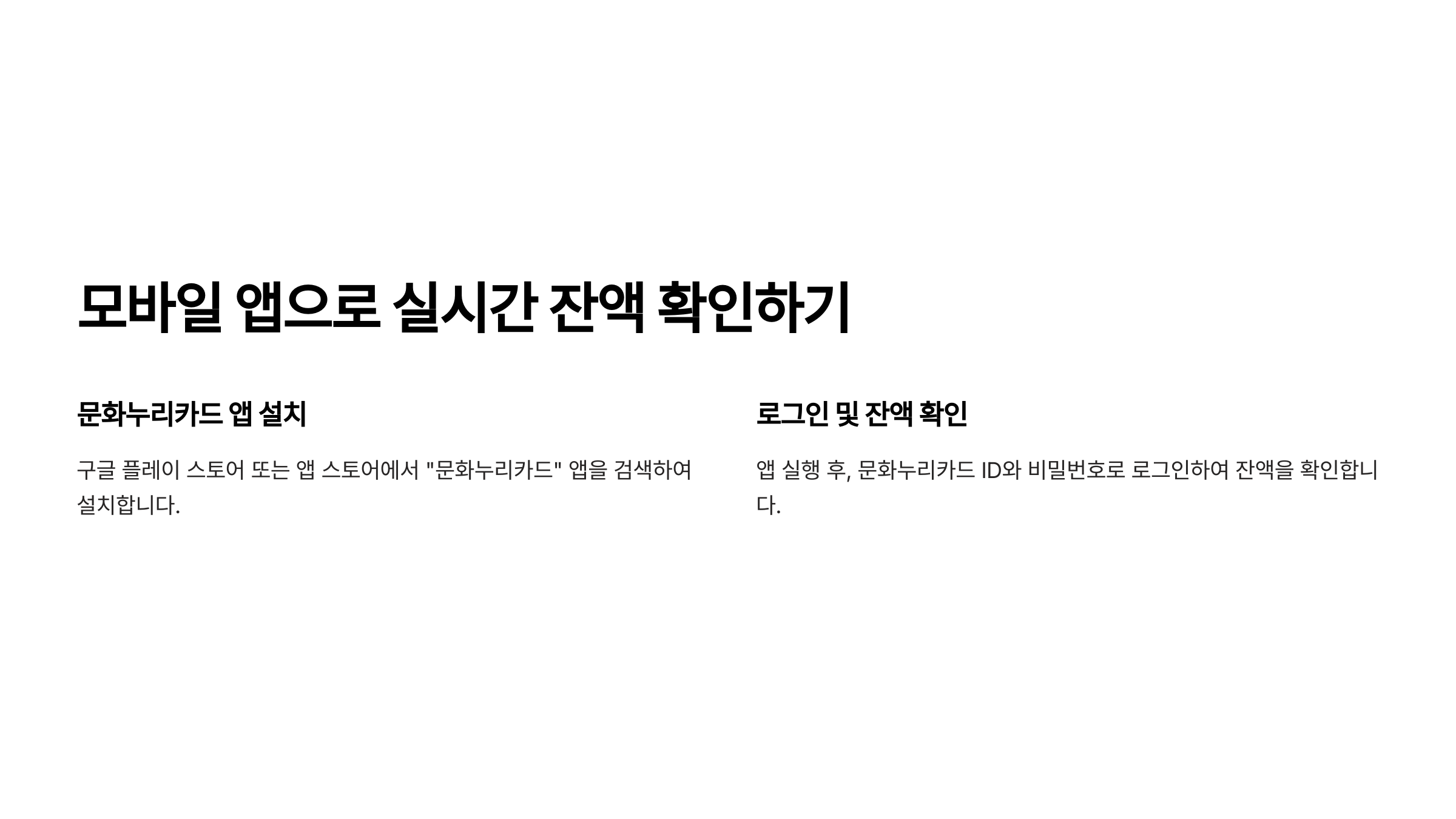 2️⃣ 모바일 앱 (문화누리카드 앱) 👉 플레이스토어 & 앱스토어에서 ‘문화누리카드’ 검색 후 설치, 카드번호 입력하면 잔액 확인 가능