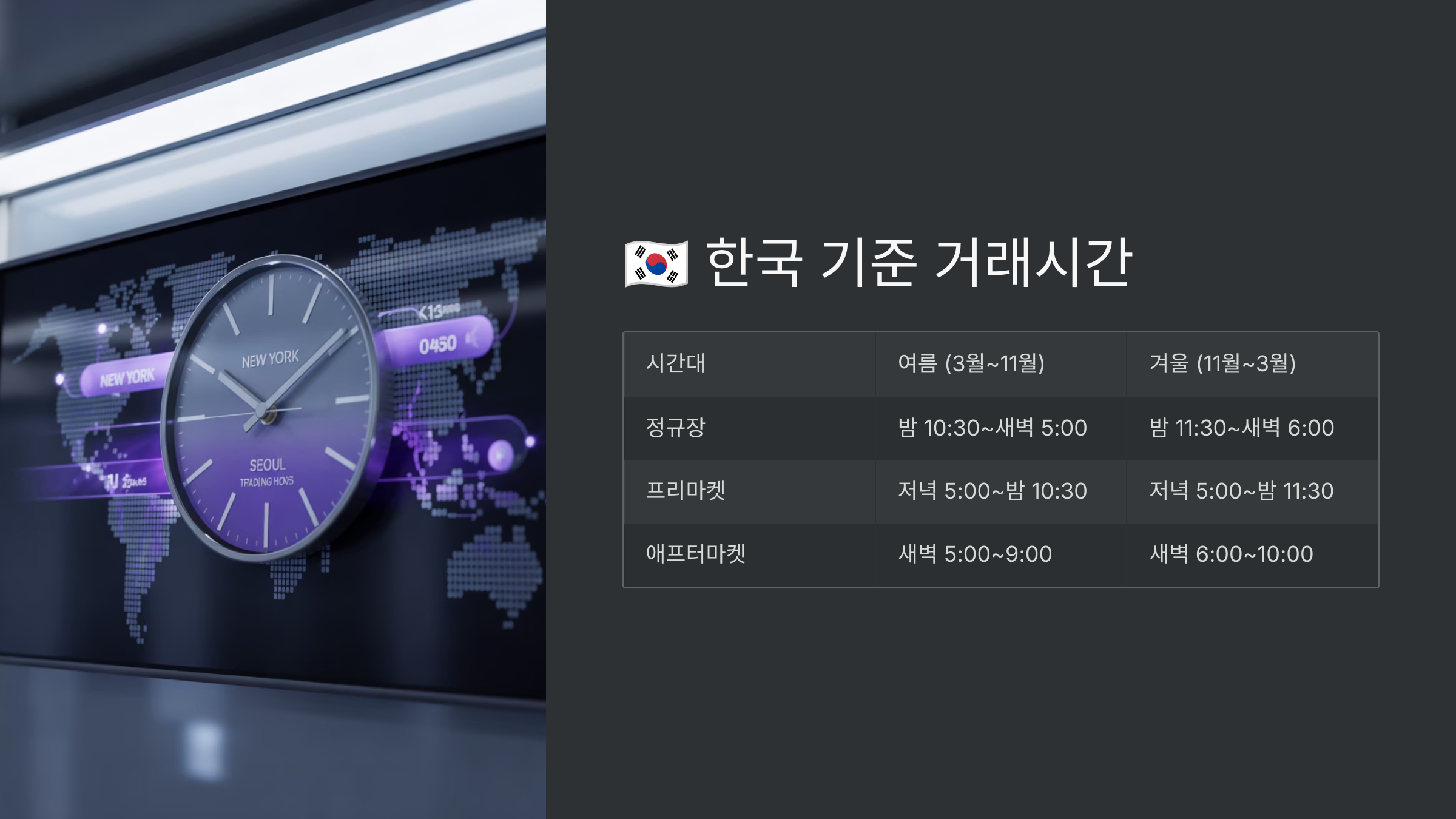한국 기준으로 하루를 정리하면 이렇게 돼요: 오후 5시~밤 10시 30분 프리마켓, 밤 10시 30분~새벽 5시 정규장, 새벽 5시~9시 애프터마켓이에요. 미국 증시는 거의 밤샘 거래인 셈이죠. 🌙