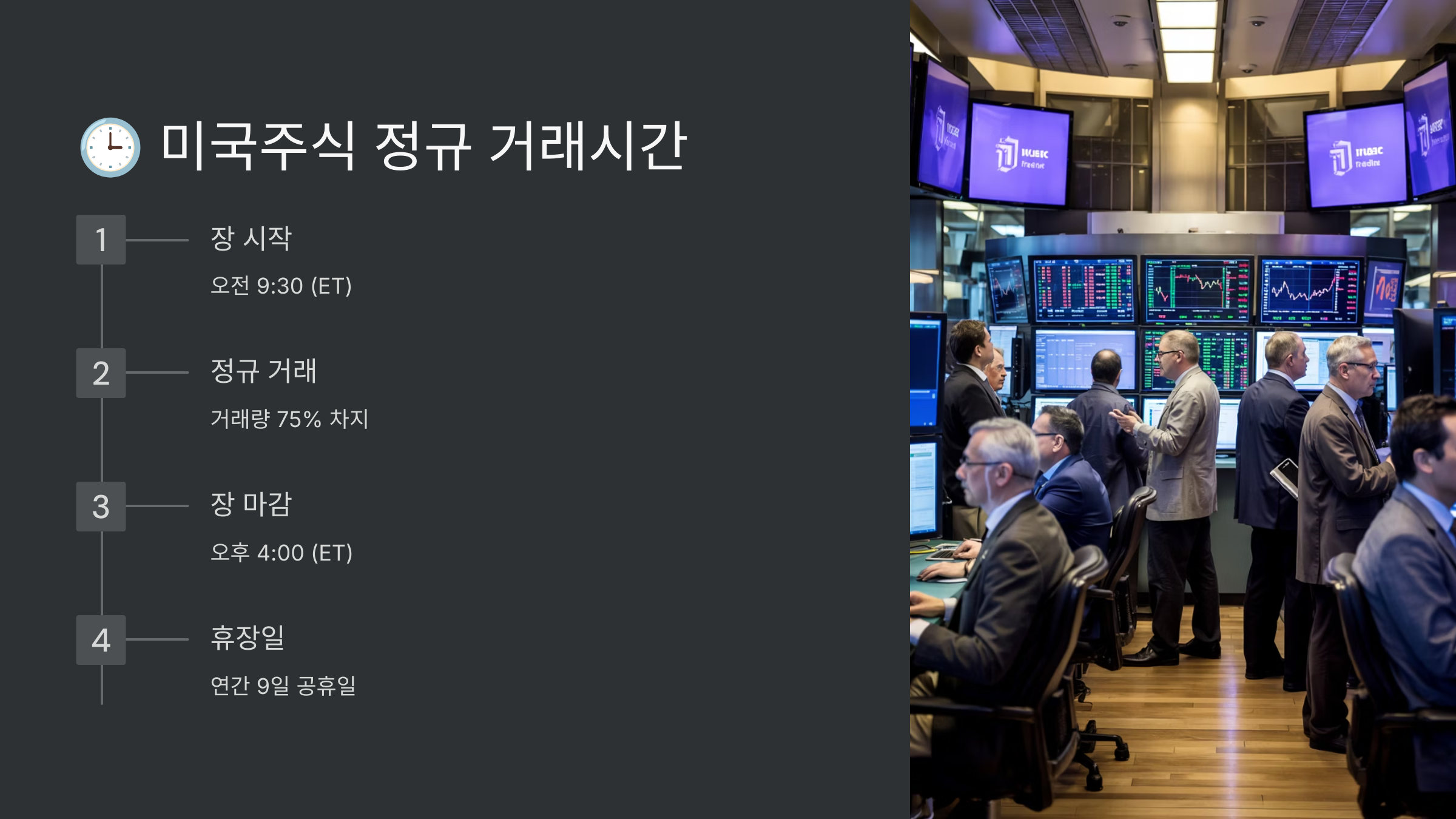 미국주식의 정규 거래시간은 미국 동부 표준시 기준으로 오전 9시 30분부터 오후 4시까지예요. 한국 기준으로는 썸머타임 적용 여부에 따라 밤 10시 30분 또는 밤 11시 30분에 시작해서 다음 날 새벽 5시까지 거래가 가능해요.