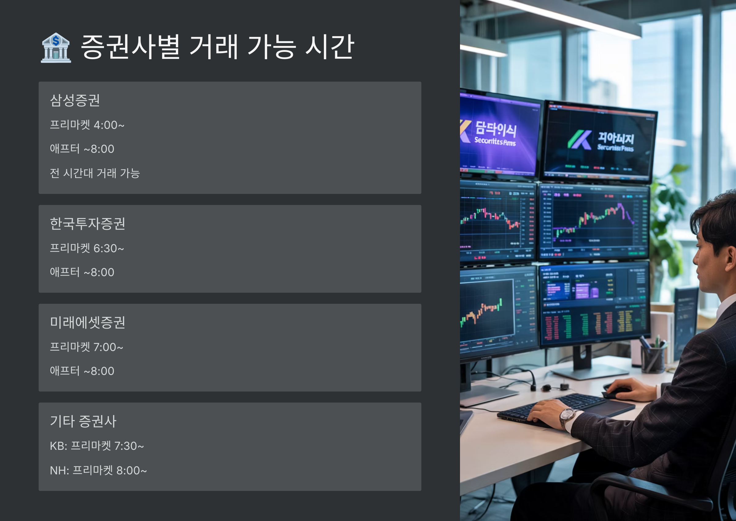 삼성증권과 NH투자증권은 시스템에 따라 다소 제한이 있어요. 일부 증권사는 프리마켓만 지원하거나, 애프터마켓은 주문만 가능하고 체결은 되지 않는 경우도 있어요.