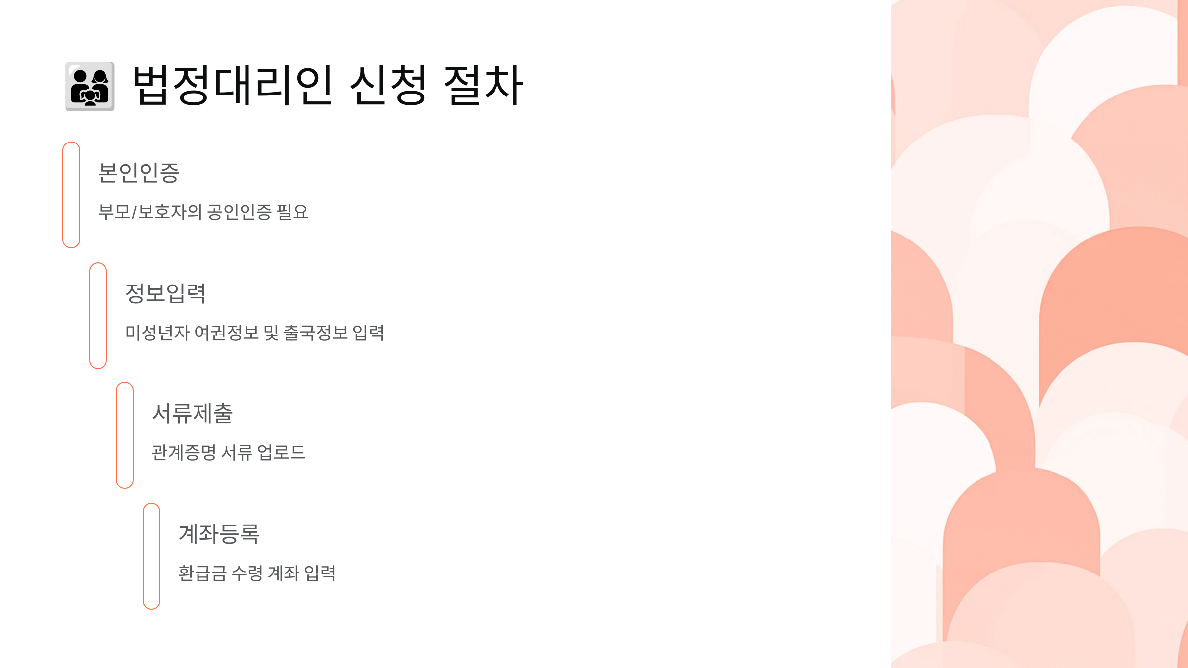 미성년자의 출국납부금 환급은 반드시 법정대리인이 신청해야 해요. 법정대리인은 일반적으로 부모를 의미하며, 특수한 경우 법원에서 지정한 후견인이 될 수도 있어요. 온라인 신청 시에는 법정대리인 본인 인증 후 미성년자의 정보를 입력하는 방식으로 진행된답니다. 이 과정이 처음엔 복잡해 보일 수 있지만, 단계별로 차근차근 따라하면 어렵지 않아요! 👪