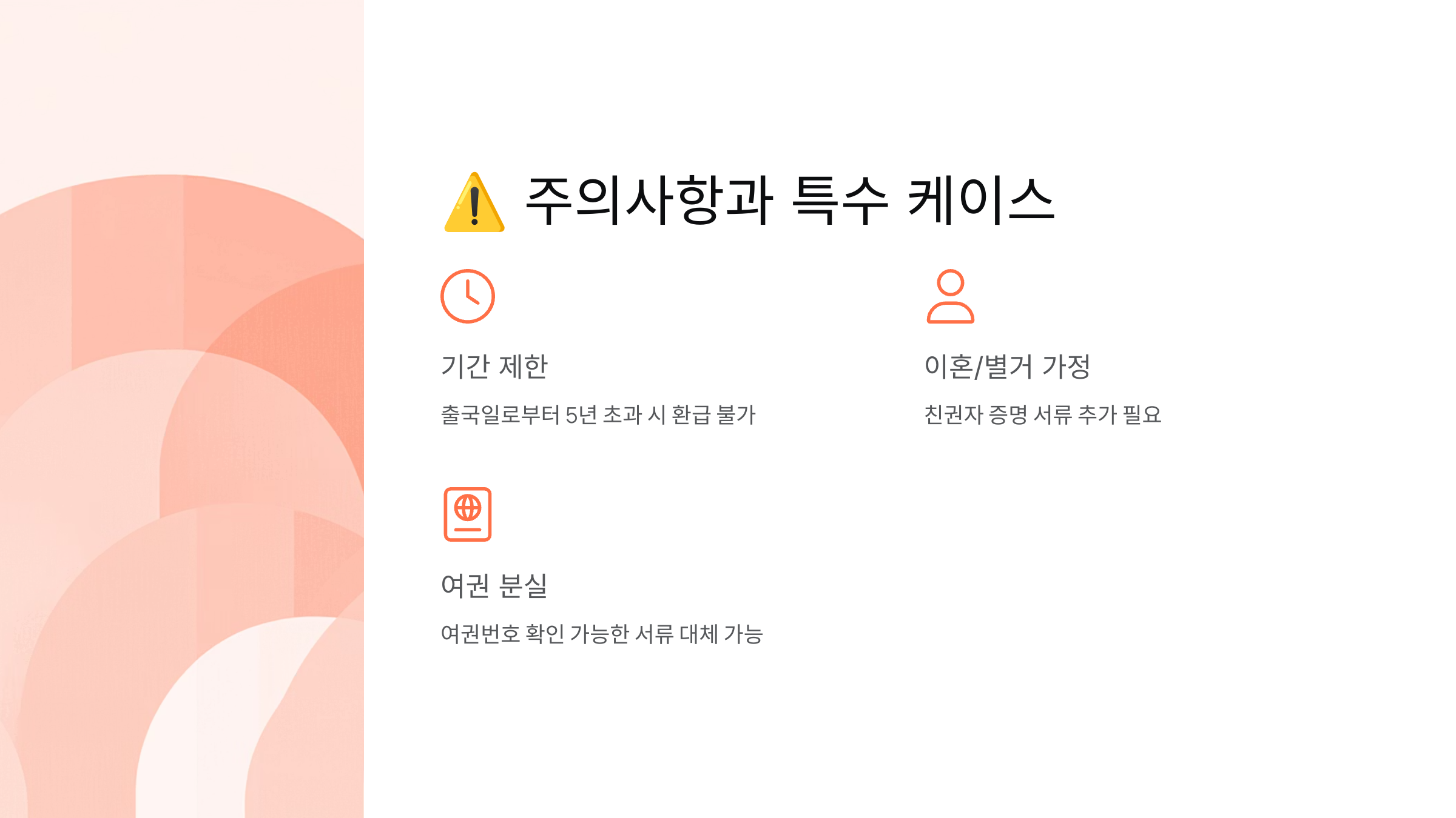 이중국적 미성년자의 환급도 가능해요. 한국 국적을 보유하고 있다면 다른 국적을 함께 가지고 있어도 환급 대상이 돼요. 다만 한국 여권으로 출국한 경우에만 해당하며, 외국 여권으로 출국했다면 환급받을 수 없어요. 출국 시 사용한 여권을 정확히 확인하고 신청하세요!