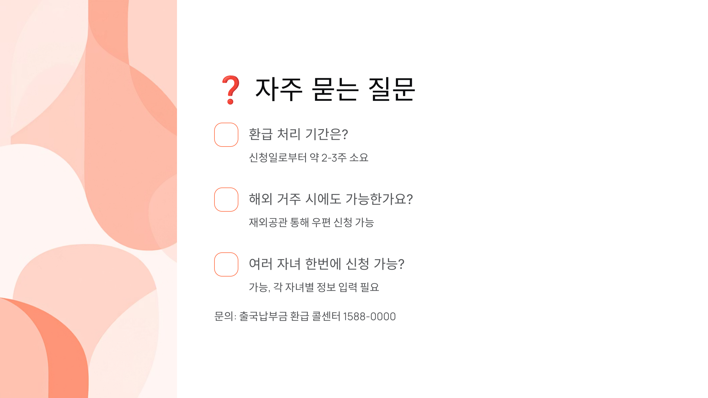 마지막으로 강조하고 싶은 팁은 정기적인 확인 습관이에요. 3개월에 한 번씩 출국 기록을 확인하고 환급 신청 여부를 체크하는 습관을 만들어보세요. 특히 조부모나 친척이 아이와 여행을 다녀온 경우 놓치기 쉬운데, 정기적으로 확인하면 빠짐없이 환급받을 수 있어요. 작은 습관이 큰 절약으로 이어진답니다! 💰