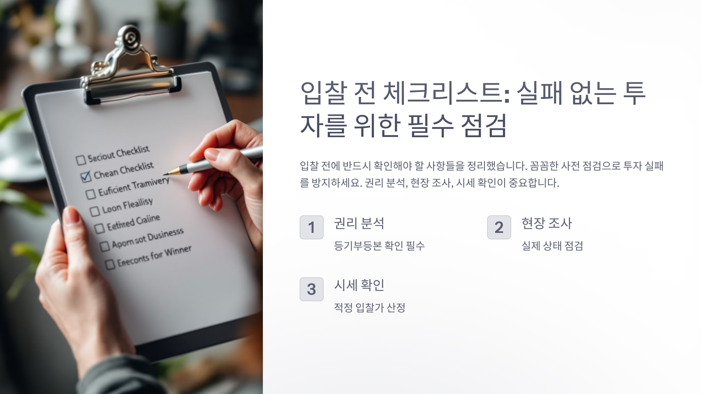 경매에 참여하기 전에는 반드시 철저한 사전조사가 필요해요. 무작정 입찰하면 예상치 못한 문제를 만날 수 있거든요. 📋 그래서 중요한 체크리스트를 준비했어요.