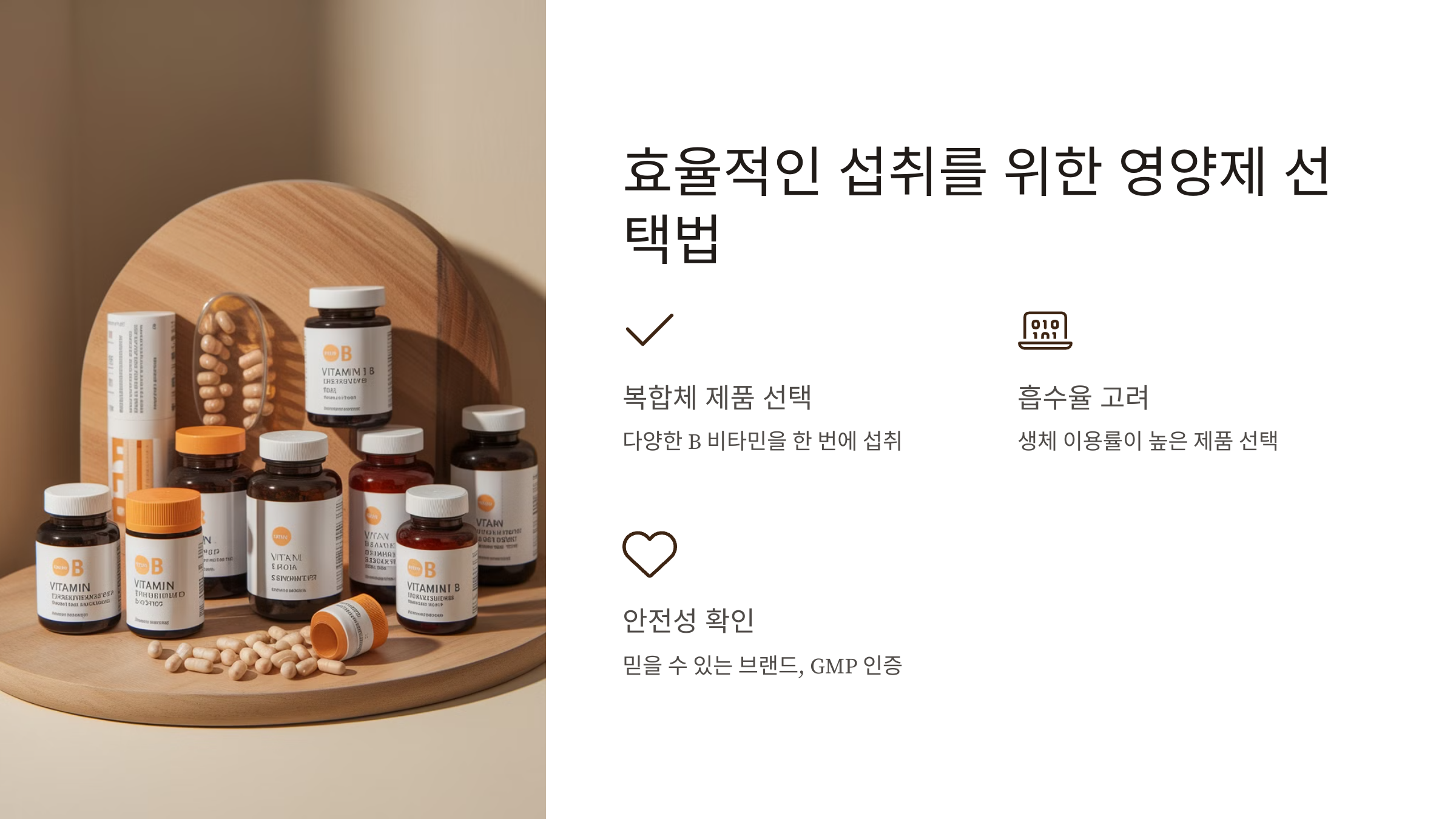 음식만으로 충분한 비타민B복합체를 섭취하기 어려운 경우, 영양제를 선택하는 것도 좋은 방법이에요. 특히 스트레스가 많거나 만성 피로를 느끼는 현대인들에게는 비타민B 보충제가 큰 도움이 될 수 있어요.