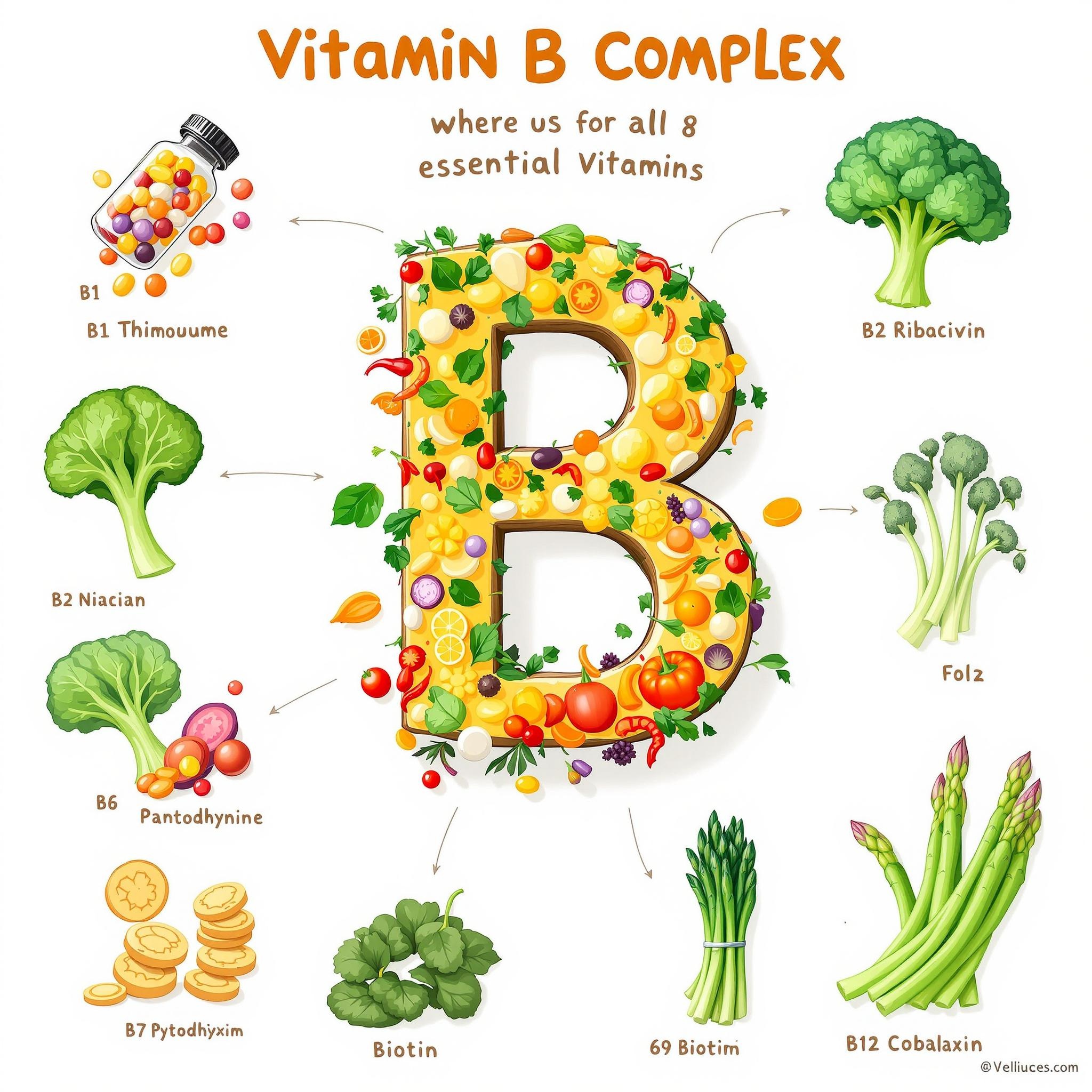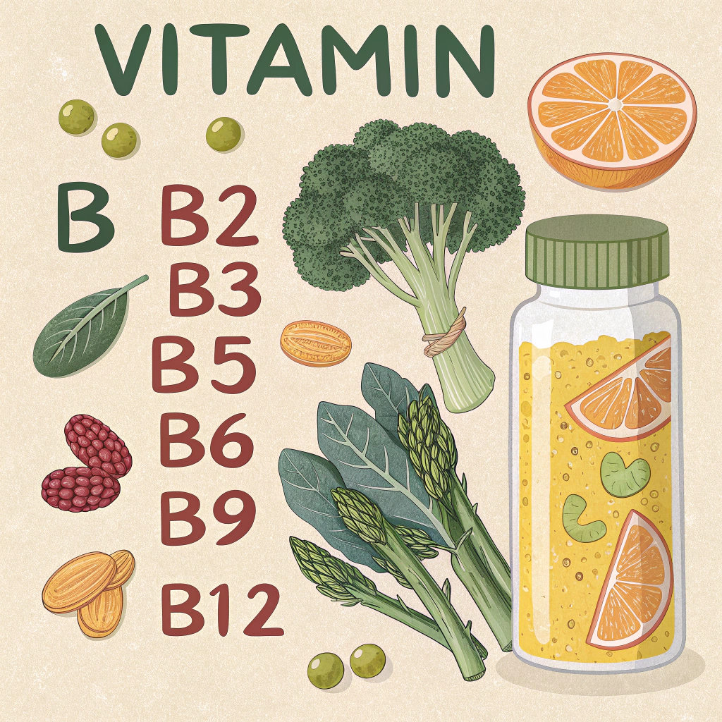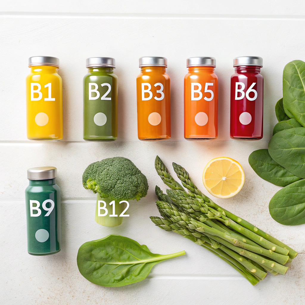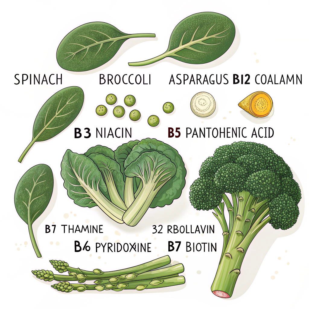 채소 중에서는 시금치, 브로콜리, 아스파라거스와 같은 녹색 채소가 비타민B9(엽산)을 다량 함유하고 있어요. 통곡물과 견과류는 비타민B1, B3, B5의 좋은 공급원이기도 하죠. 채식주의자라면 비타민B12는 보충제를 통해 섭취하는 것이 필요할 수 있어요.
